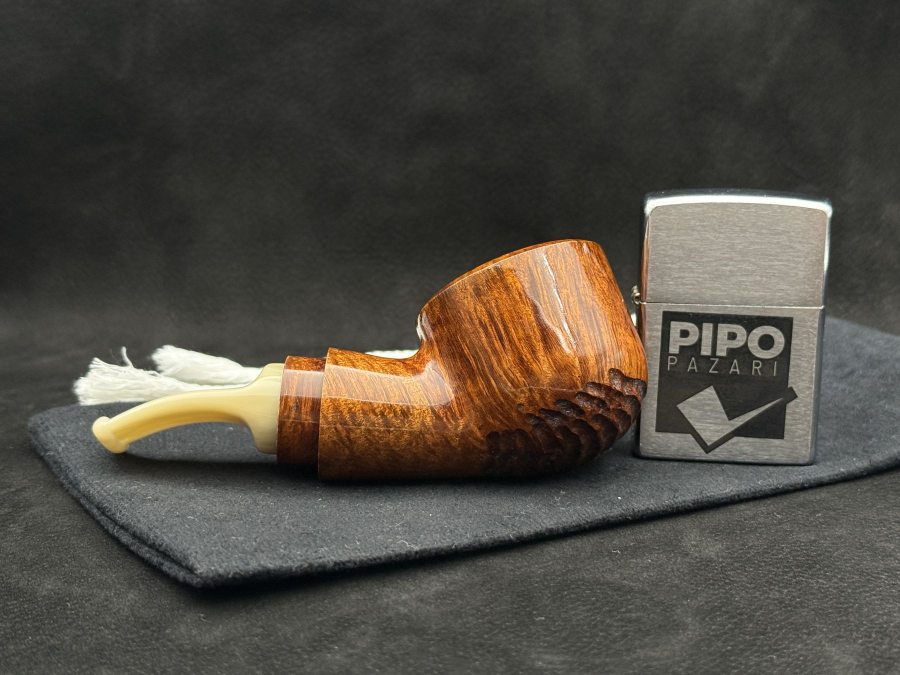 Bu pipo, smooth cilasıyla ışığı değil gölgeyi kontrol eder; üst yüzey parlak bir meydan okuma değil, disiplinli bir yüzey olgunluğudur. Bowl’un altındaki rustik alan, dokunun görsel yoğunluğunu abartmadan taşıyan bir zemin hissi verir; üstteki pürüzsüz alanla rekabete girmez, onu destekler. Renkler güçlü değil, akılcıdır; ceviz tonları akışta süreklilik hissi verir. Akrilik stem’in kehribar şeffaflığı, pipo gövdesinin sıcaklığıyla uyumlu ama ona öykünmeyen bir karşılık kurar. Bu model, dokuda çeşitlilik, siluette birlik hissi taşır.