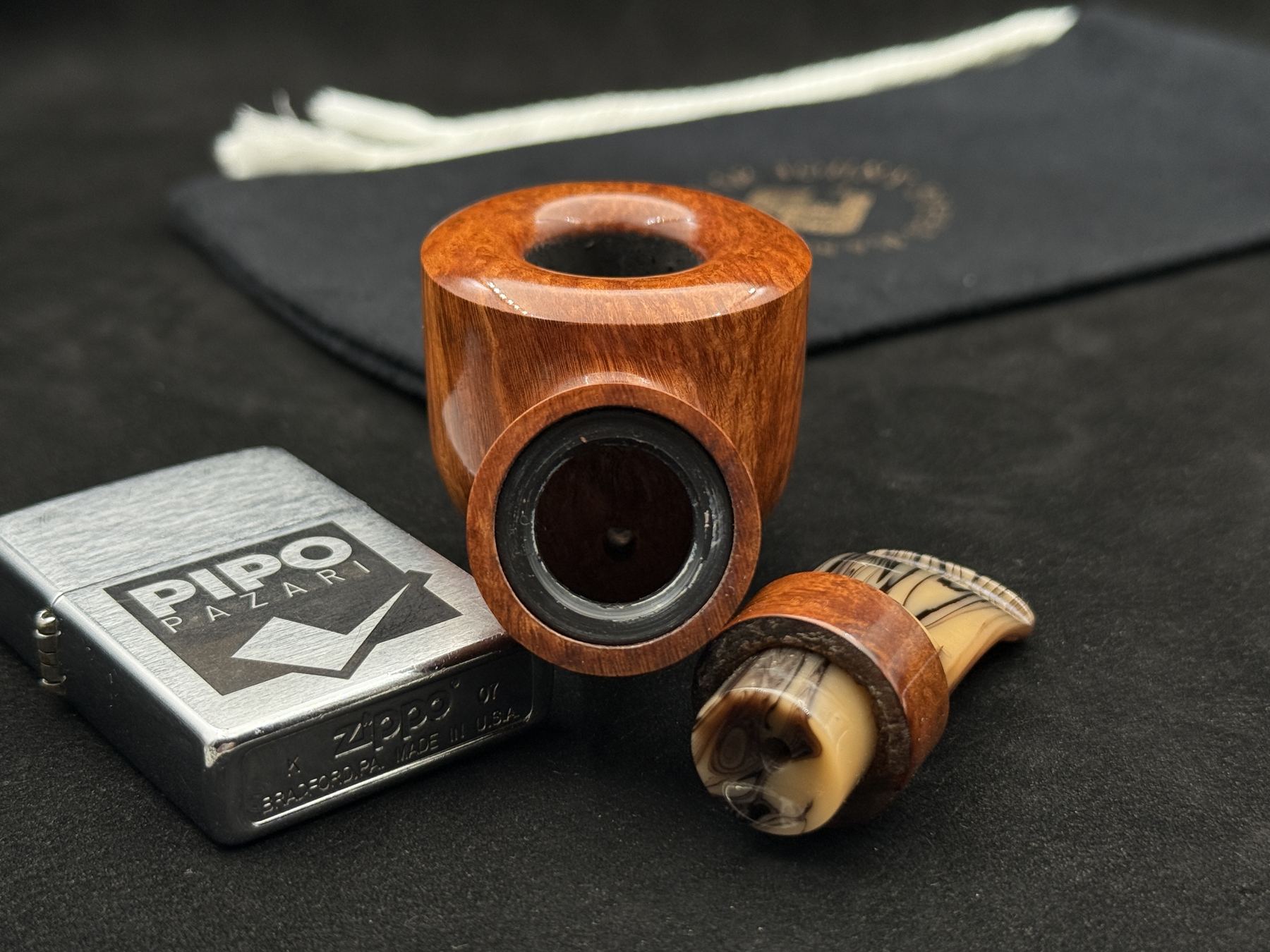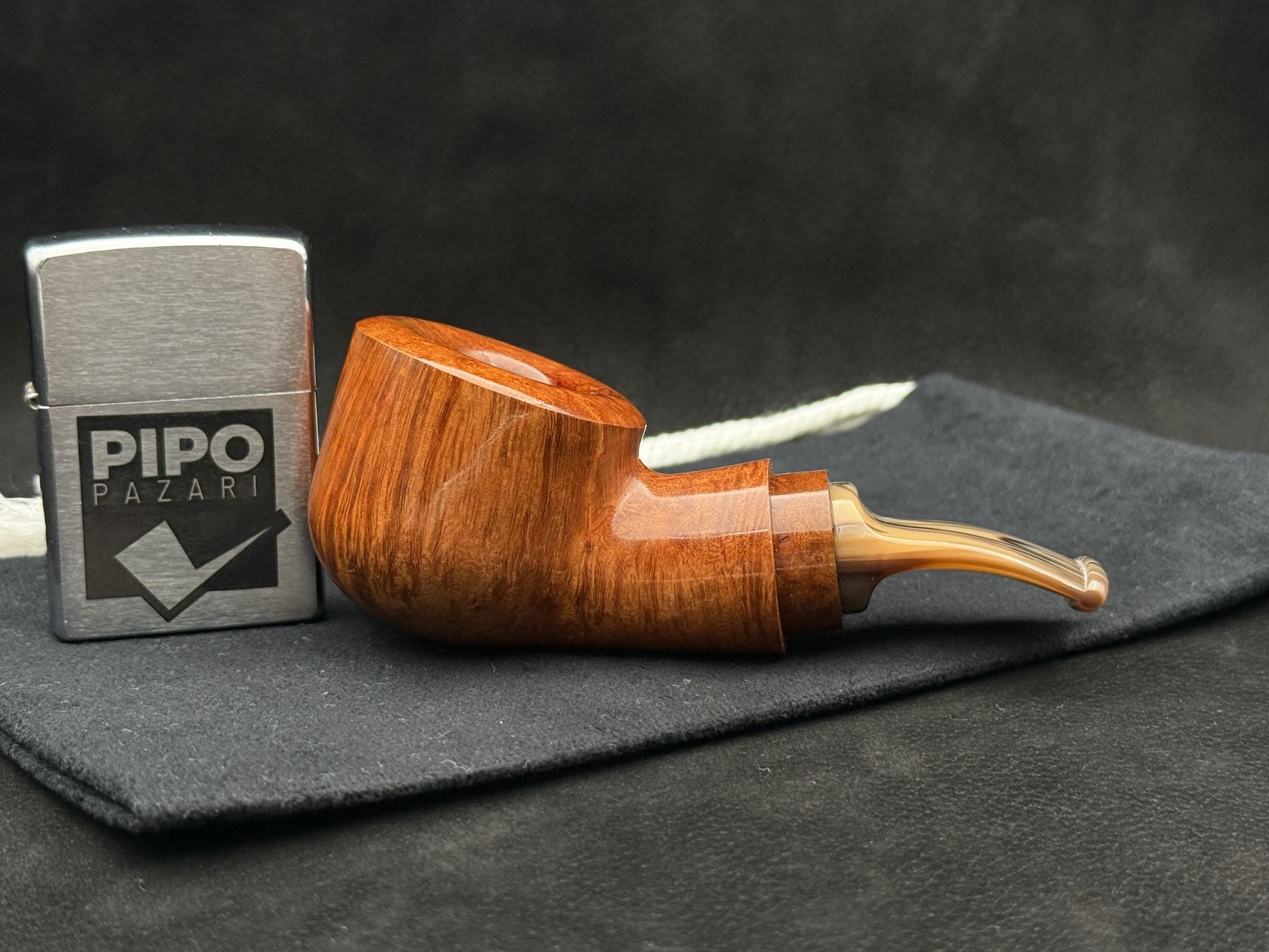 Bu pipo, smooth yüzeyin ipeksi akışını metalik veya parlak bir iddiaya dönüştürmeden taşır. Bowl’un küresel gövdesi, ahşap yüzükle bölünmeyen ama onun tarafından çerçevelenen bir oran hissi sunar. Doğal bal ve ceviz tonları, yüzeyde sakin bir kontrast kurar; renk anlatıyı bastırmaz, sadece yön verir. Akrilik stem’in koyu şeffaflığı, formu bölmeden eşlik eden çağdaş bir dokusal partner gibi çalışır. Bu model, gözde değil zihinde yer eden bir estetik iskelet taşır; sessiz ama iz bırakıcı bir form olgunluğunun ürünüdür.