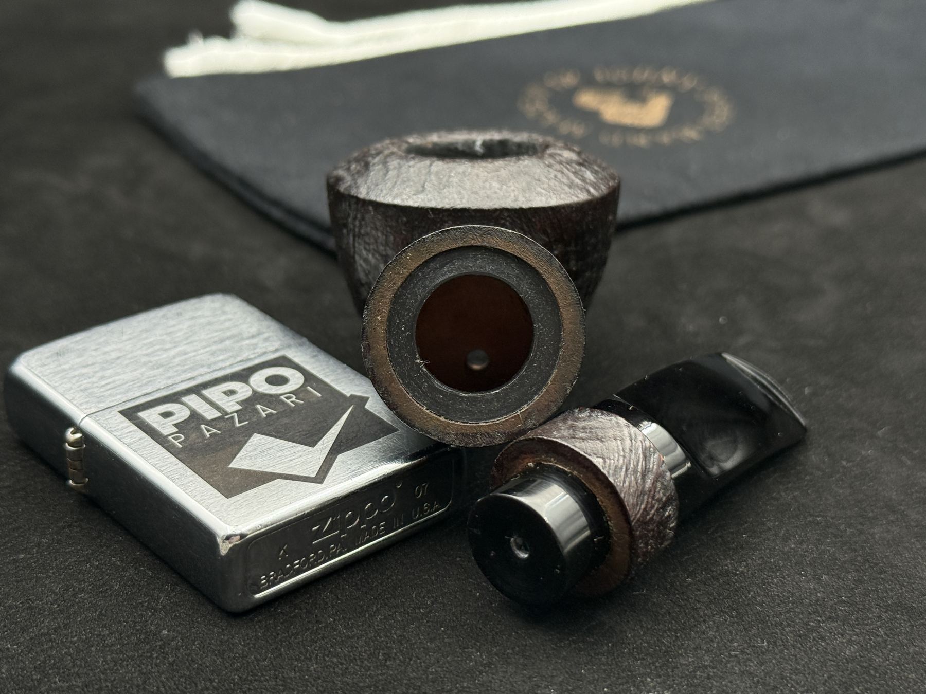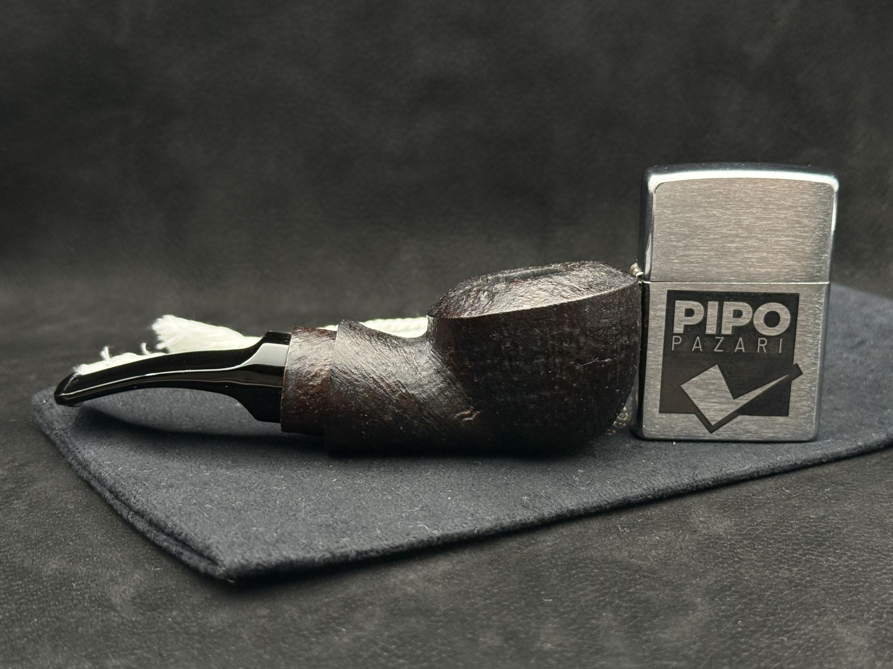 Bu piponun kumlama yüzeyi, briar’ın damarlarını “parlatmadan” görünür kılar; doku olgun ama gürültüsüzdür. Bowl’un üstten açılan eğrisi, sandblast’in yarattığı mikro gölge oyunlarıyla desteklenir; fakat yoğun bir renk anlatısı taşımaz. Ahşap yüzük detayı, kumlamanın ritmini bastırmayan bir denge noktası olur. Stem’in siyah akrilik şeffaflığı, kumlanmış gövdenin mat ritmini bölmeden eşlik eder. 404, JohnnyPipes’in dokuda nefes bırakan ama kelimede tekrar etmeyen bir yorumudur.