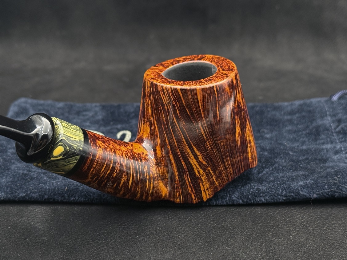 Danimarka pipoculuğunun el işçiliğiyle şekillenen zarif örneklerinden biri olan bu GR4 model, geniş haznesi ve düz tabanlı gövdesiyle hem dengeli hem de karakter sahibi bir duruş sergiliyor. Koyu kahverengi ve turuncu tonların iç içe geçtiği doğal briar damarları, pürüzsüz yüzeyde sıcak ve zengin bir görsellik yaratıyor.