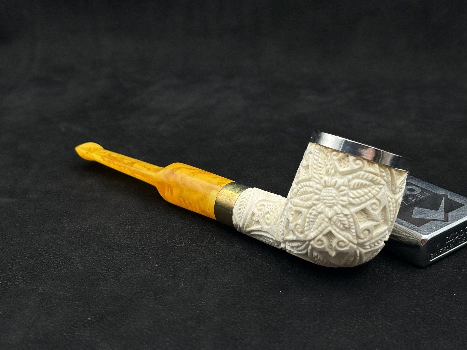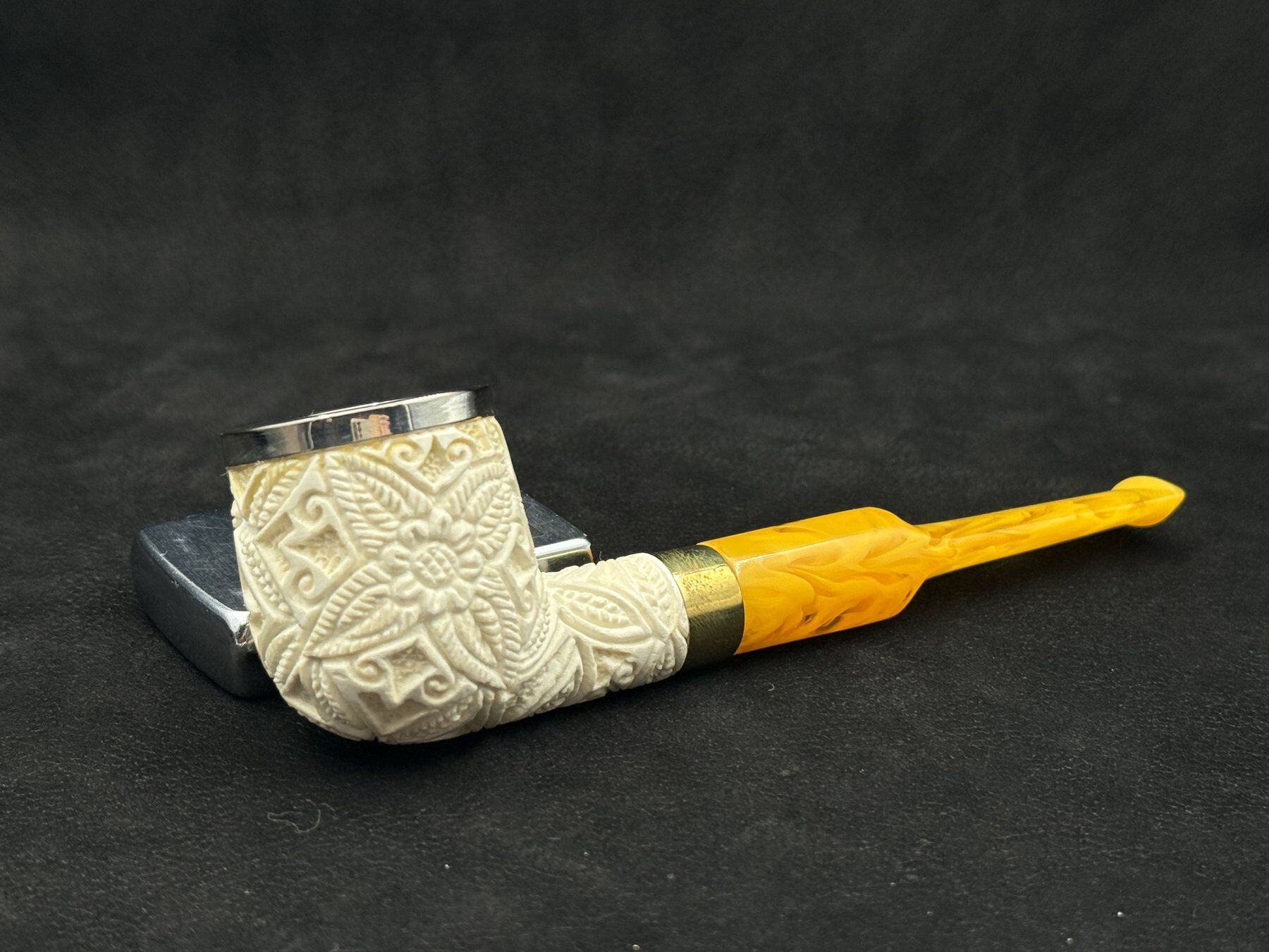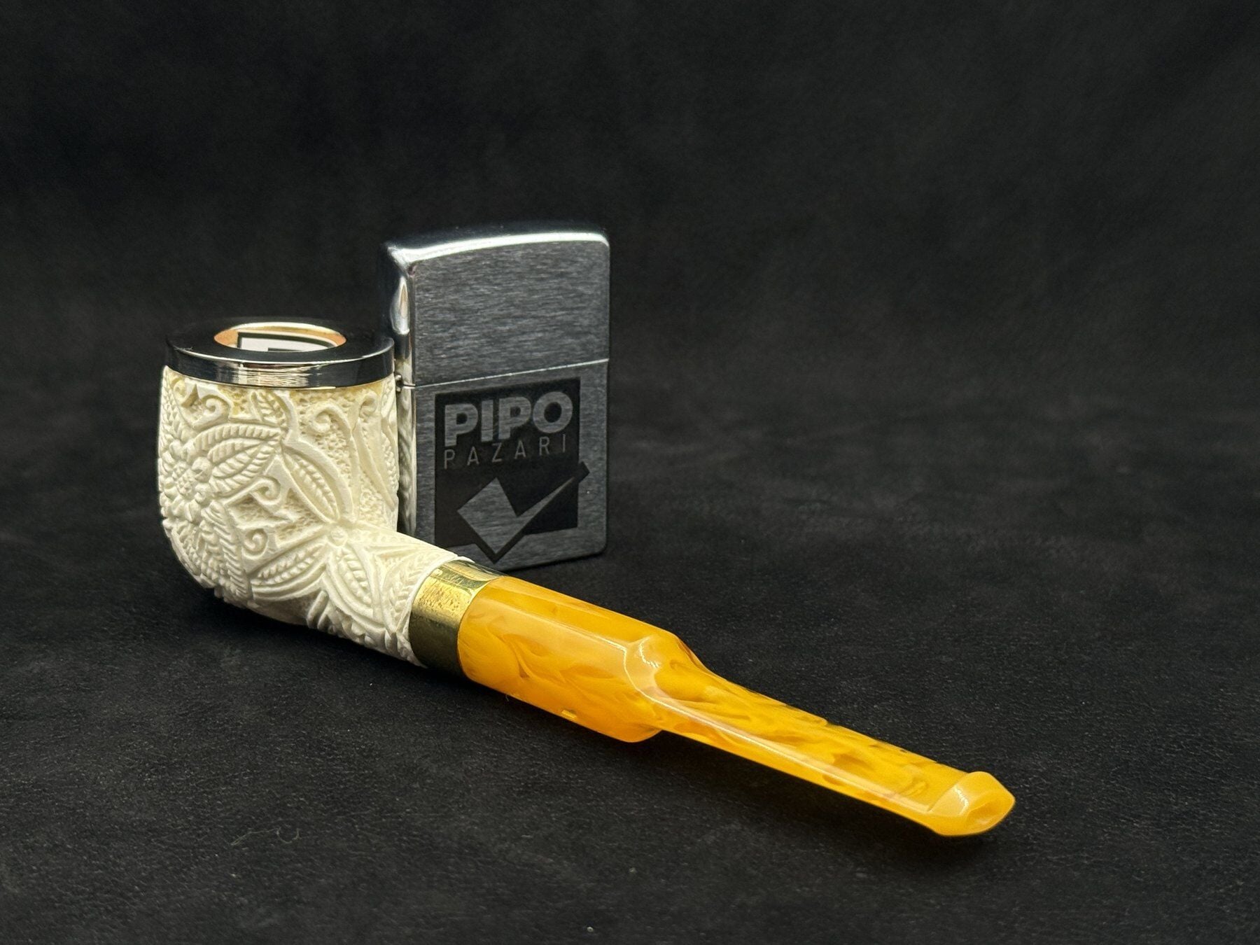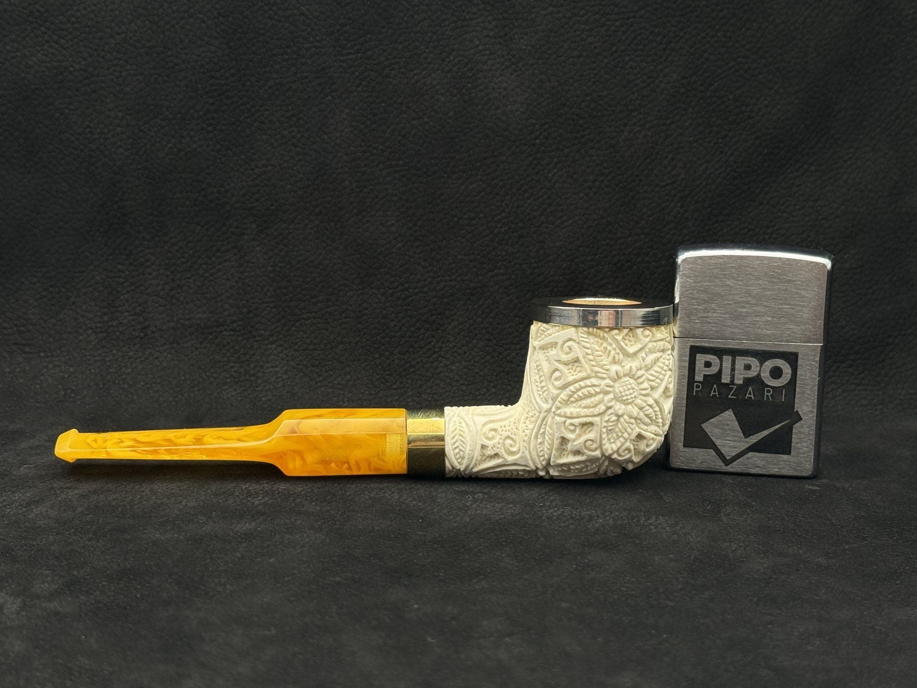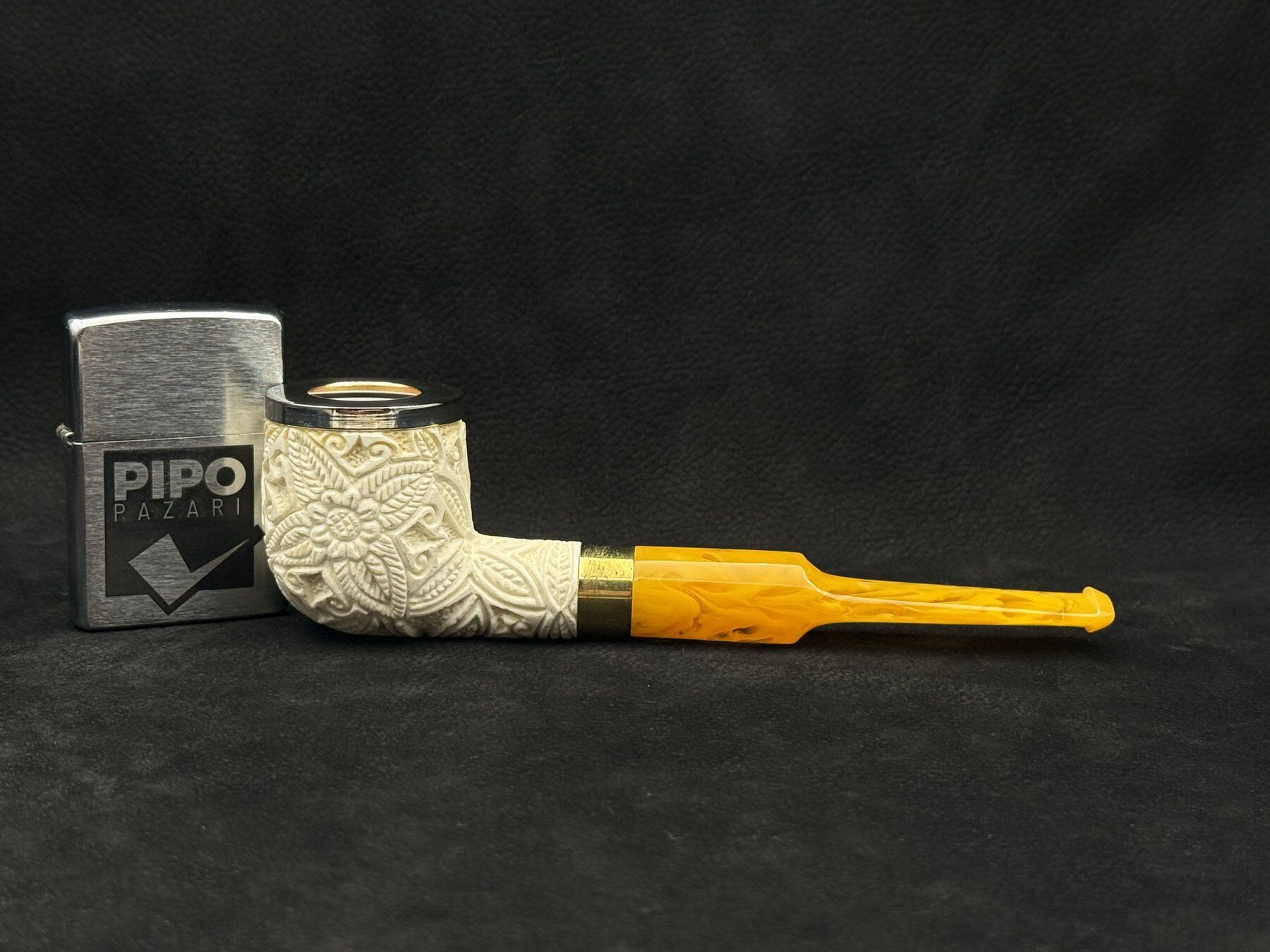 Bu Altınay lületaşı pipo, gövdeyi çevreleyen detaylı çiçek oyma kompozisyonuyla öne çıkar. Pot billard formunun geniş ve dengeli haznesi, oyma motiflerin yüzeyde daha belirgin ve güçlü görünmesini sağlar. Lületaşının doğal beyaz tonu, ustanın işlediği desenleri net şekilde ortaya çıkarırken hazne ağız kısmındaki metal rim hem görsel bir vurgu hem de kullanımda koruyucu bir detay olarak tasarıma eklenmiştir.