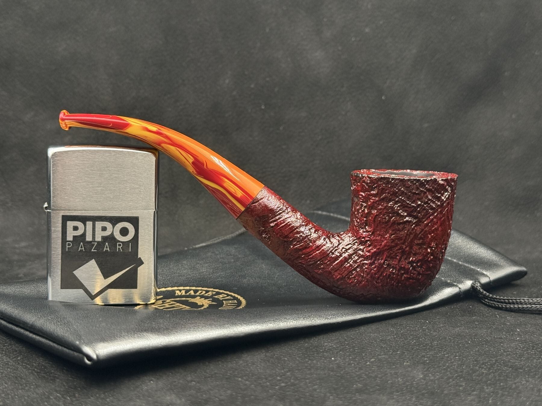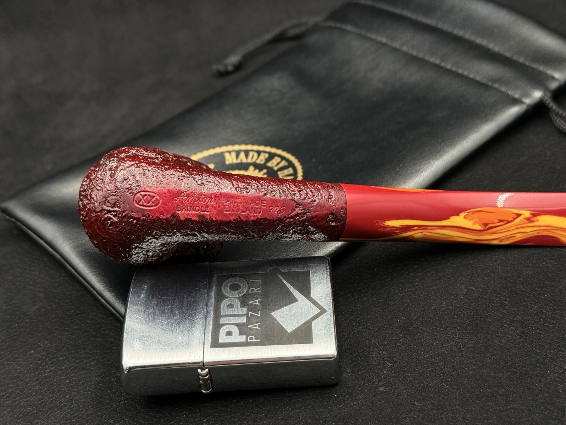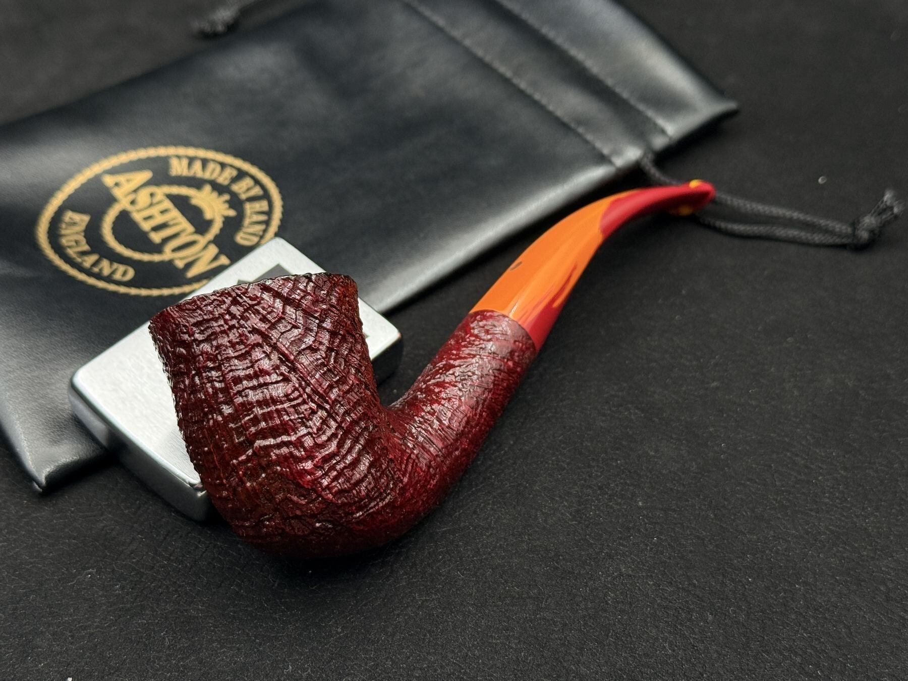 Derin kumlama (sandblast) yüzeyi, briar ağacının doğal damar yapısını güçlü şekilde vurgularken elde kaymaz ve tok bir hissiyat sunar. Ashton’ın imzası haline gelen sarı-kırmızı geçişli Ashtonit ağızlık ise bu modele benzersiz bir görsel karakter kazandırır.