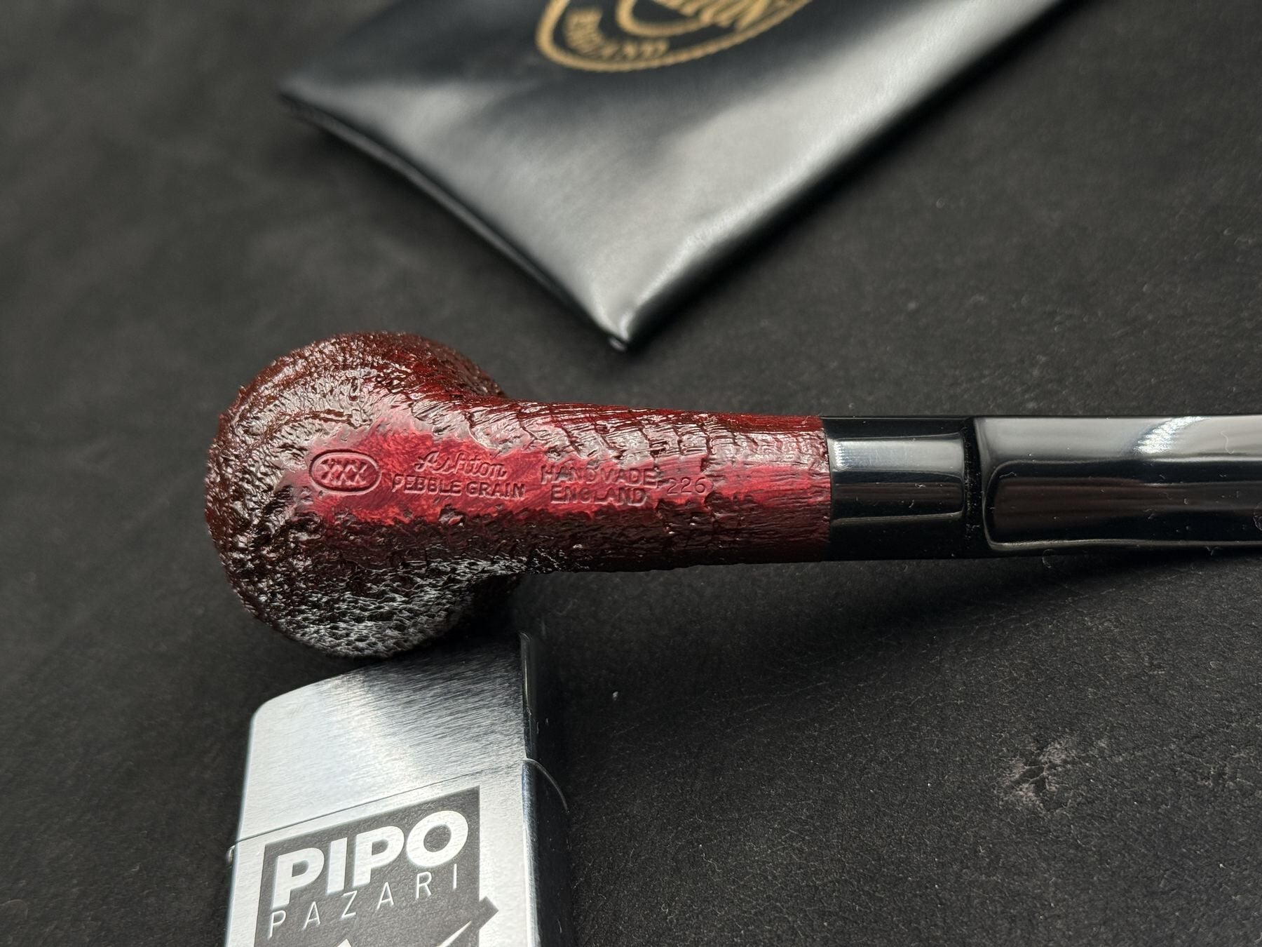 Pebble Grain kumlama, Ashton’ın ustalığını yansıtan özel bir yüzey işçiliğidir. Daha iri ve belirgin dokular, pipoya güçlü bir karakter kazandırırken aynı zamanda kullanım sırasında güvenli ve rahat bir tutuş sağlar. Bu yüzey, klasik İngiliz pipo estetiğinin daha maskülen ve belirgin bir yorumudur.