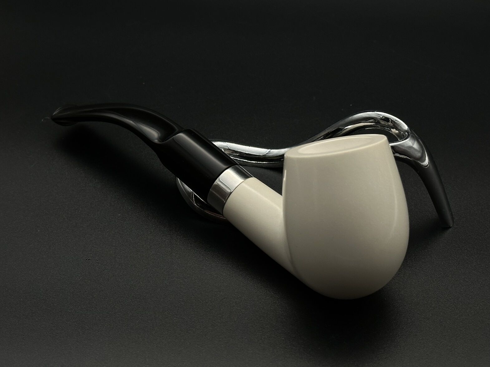 Bu bent form model, lületaşının yumuşak dokusunu akıcı bir siluetle buluşturur. Gövde, keskin çizgilerden bilinçli olarak kaçınılarak yuvarlatılmış; boyun ve ağızlık hattı ise içimi destekleyen bir akışla şekillendirilmiştir. Gövdeyle ağızlık arasında kullanılan 925 ayar gümüş yüzük, modele hem görsel bir denge hem de klasik bir zarafet katar. Gümüş detay, lületaşının açık tonuyla güçlü ama sade bir kontrast oluşturur; bu da piponun genel estetik seviyesini belirgin biçimde yükseltir.