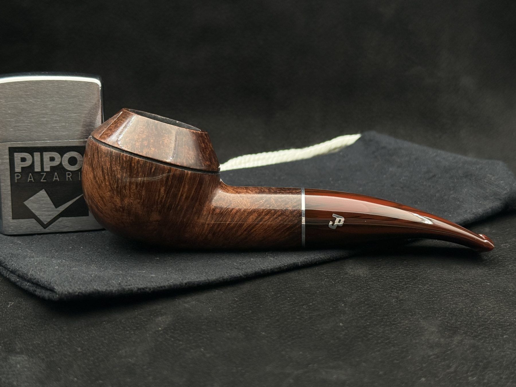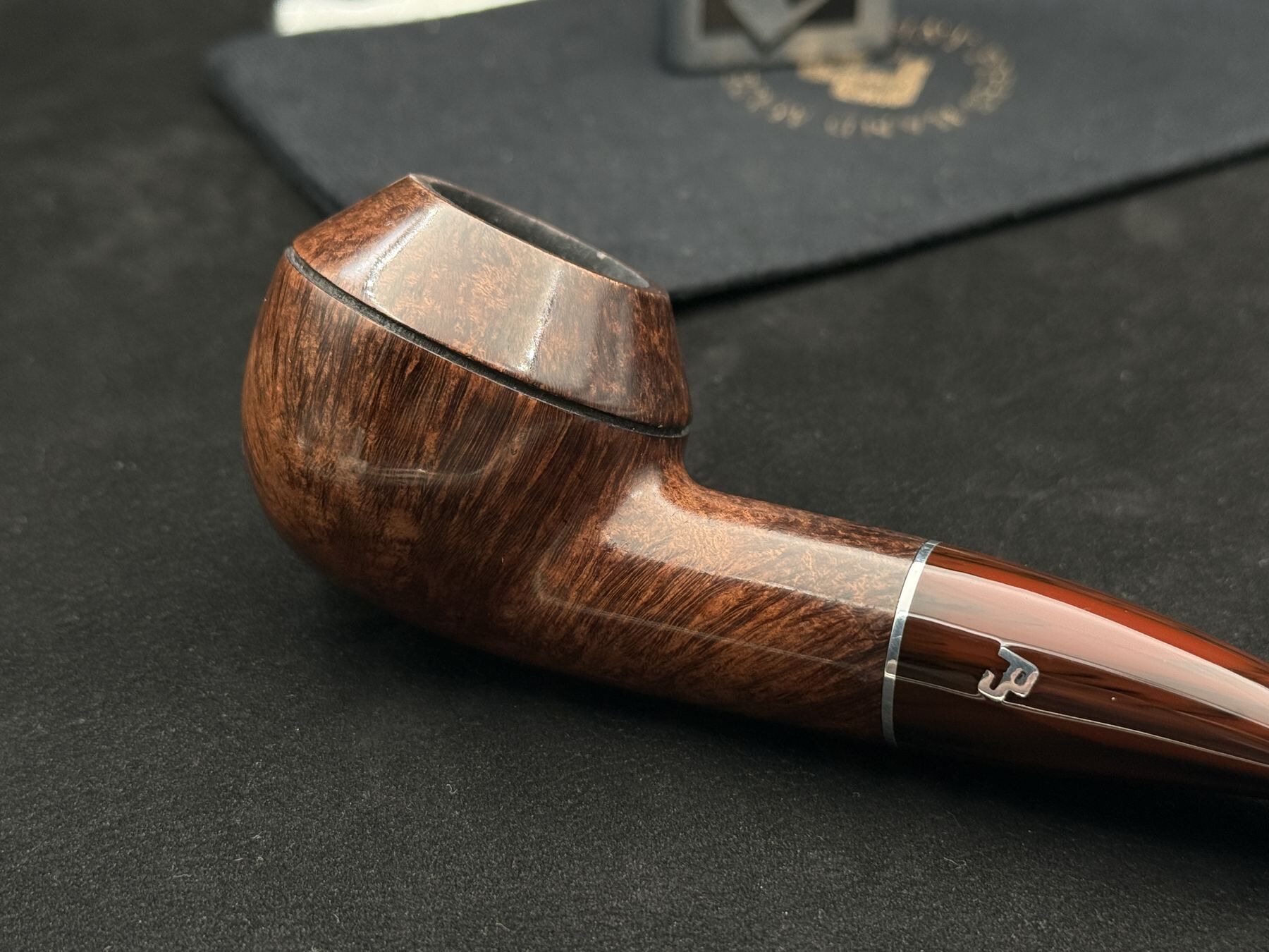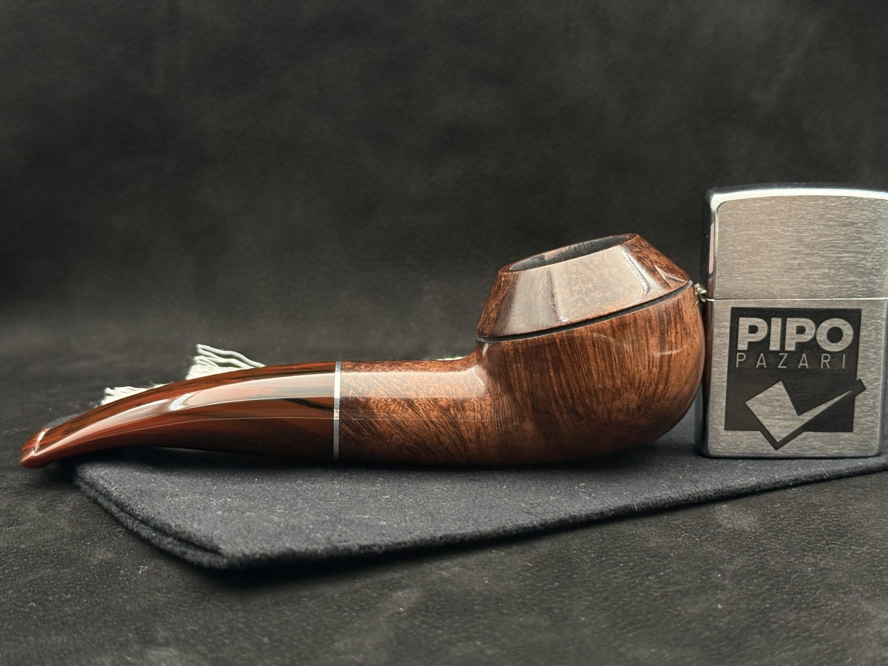 309 ASH Bent, pürüzsüz yüzeyin altında briar damarlarının akışını kesintisiz bir görsel omurga gibi sunar. Kavisli gövde, bowl’dan stem’e uzanan hatta keskin kırılmalar barındırmaz; aksine, geçişlerde doğal bir ritim duygusu oluşturur. Smooth finish, burada yalnızca yüzeyin kusursuza yakın bir sabırla işlenmiş ve kadifemsi bir görsel akışa ulaştırılmış halini anlatır. Akrilik stem, tasarımın sıcak bal tonlarıyla uyumlu bir dokunsal karşılık kurarken, shank ile bowl’un buluştuğu eğim markanın tasarım imzasını güçlü ama abartısız bir şekilde taşır. ASH serisinin model karakteri; briar’ın iç dokusunu, yüzeydeki parlaklığı kontrollü tutarak yansıtan, göz yormayan ama bakıldıkça derinleşen bir tasarım anlayışıdır. 309 shape’i, duman akışının serin ve stabil bir rotada ilerlediğini hissettiren bir görsel metafor gibi çalışır. Bu model, JohnnyPipes’in form dilini sade ama etkisi uzun süren bir mimariyle koleksiyoncuya sunar.