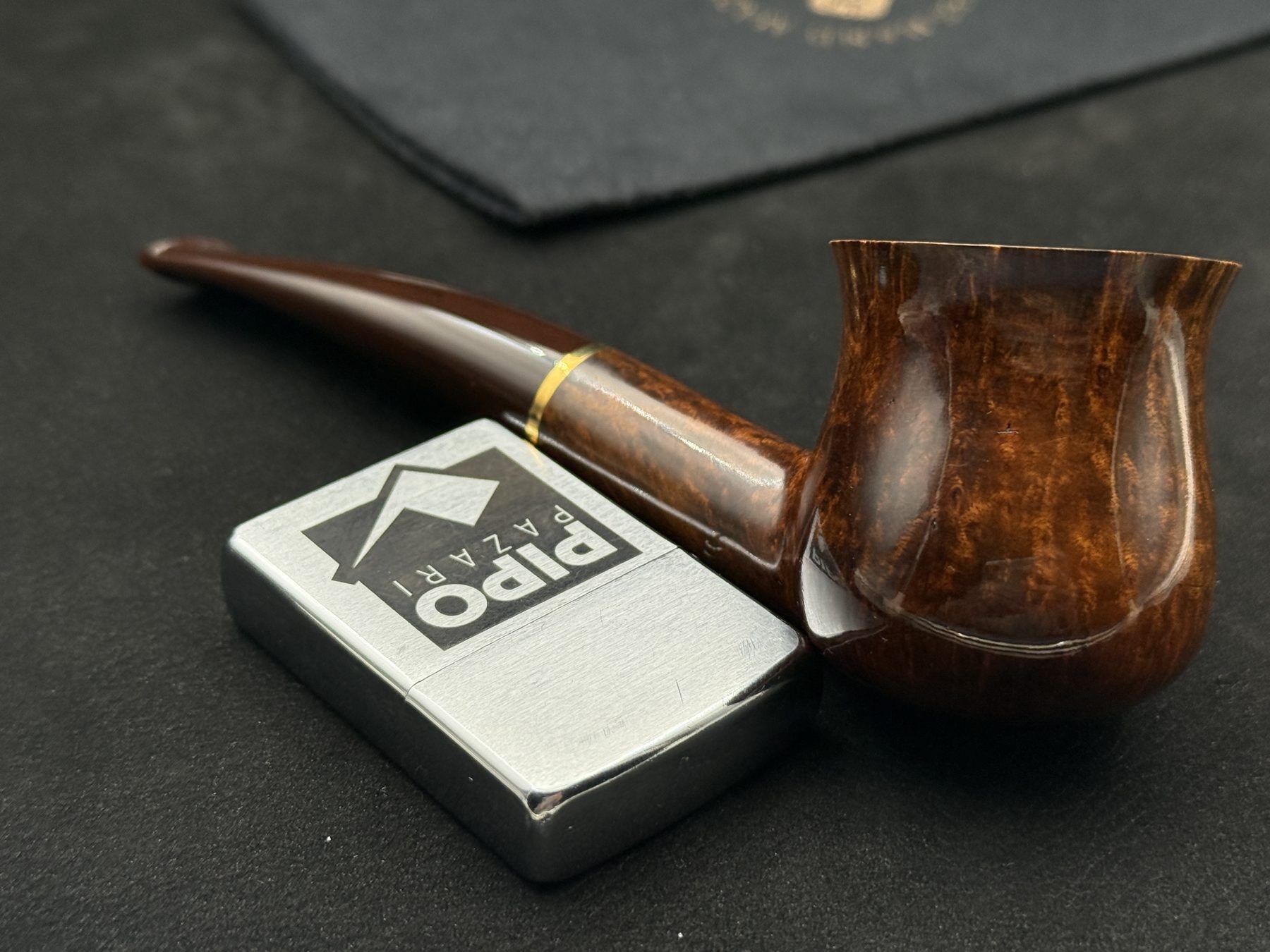 Cumberland 233 Smooth Bent modeli, sıcak kahverengi gövde ile koyu kırmızı tonlu ağızlık arasında kurduğu kontrast sayesinde oldukça asil bir görünüm oluşturuyor. Parlak bitiriş, ışığın gövde üzerinde dans etmesini sağlayarak damarların güzelliğini daha da ortaya çıkarıyor. Bent form ise piponun ağırlık merkezini ideal şekilde düzenleyerek ağızda rahat taşımayı mümkün kılıyor.