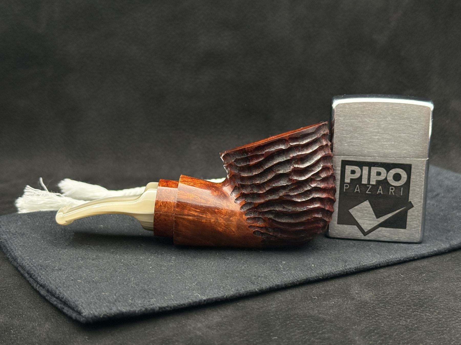 402’nin rusticated hazne çeperi, dumanın ritmini grafik bir dile çevirmeden taşıyan bir dokusal anlatı sunar. Bu pipo, cilayı değil dokuyu taşır; briar’ın ham ama dağılmayan doğasını “kontrollü pürüz” olarak gösterir. Renkler iddialı değil, doğaldır; doku üzerinden karakter kurulur, ton sadece eşlik eder. Akrilik stem’in siyah şeffaflığı, rustik yüzeyin mat ritmini bastırmadan ona modern bir temas partneri olur. 402, dokunun bağırmadığı ama sustuğunda da yok olmadığı bir estetik anlayışı taşır.