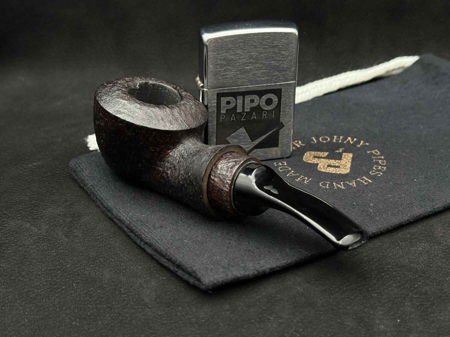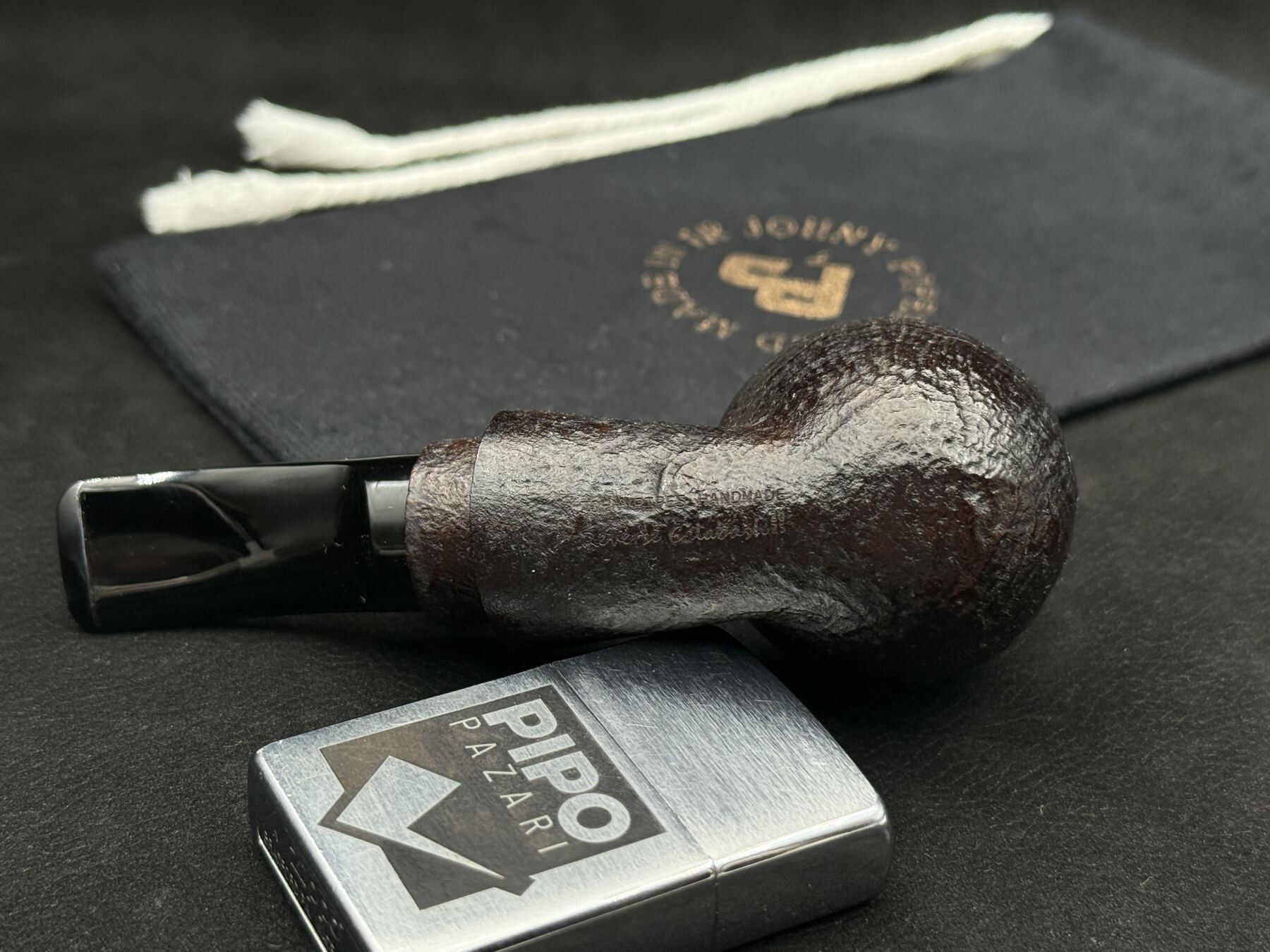Bu piponun kumlama yüzeyi, briar’ın damarlarını “parlatmadan” görünür kılar; doku olgun ama gürültüsüzdür. Bowl’un üstten açılan eğrisi, sandblast’in yarattığı mikro gölge oyunlarıyla desteklenir; fakat yoğun bir renk anlatısı taşımaz. Ahşap yüzük detayı, kumlamanın ritmini bastırmayan bir denge noktası olur. Stem’in siyah akrilik şeffaflığı, kumlanmış gövdenin mat ritmini bölmeden eşlik eder. 404, JohnnyPipes’in dokuda nefes bırakan ama kelimede tekrar etmeyen bir yorumudur.