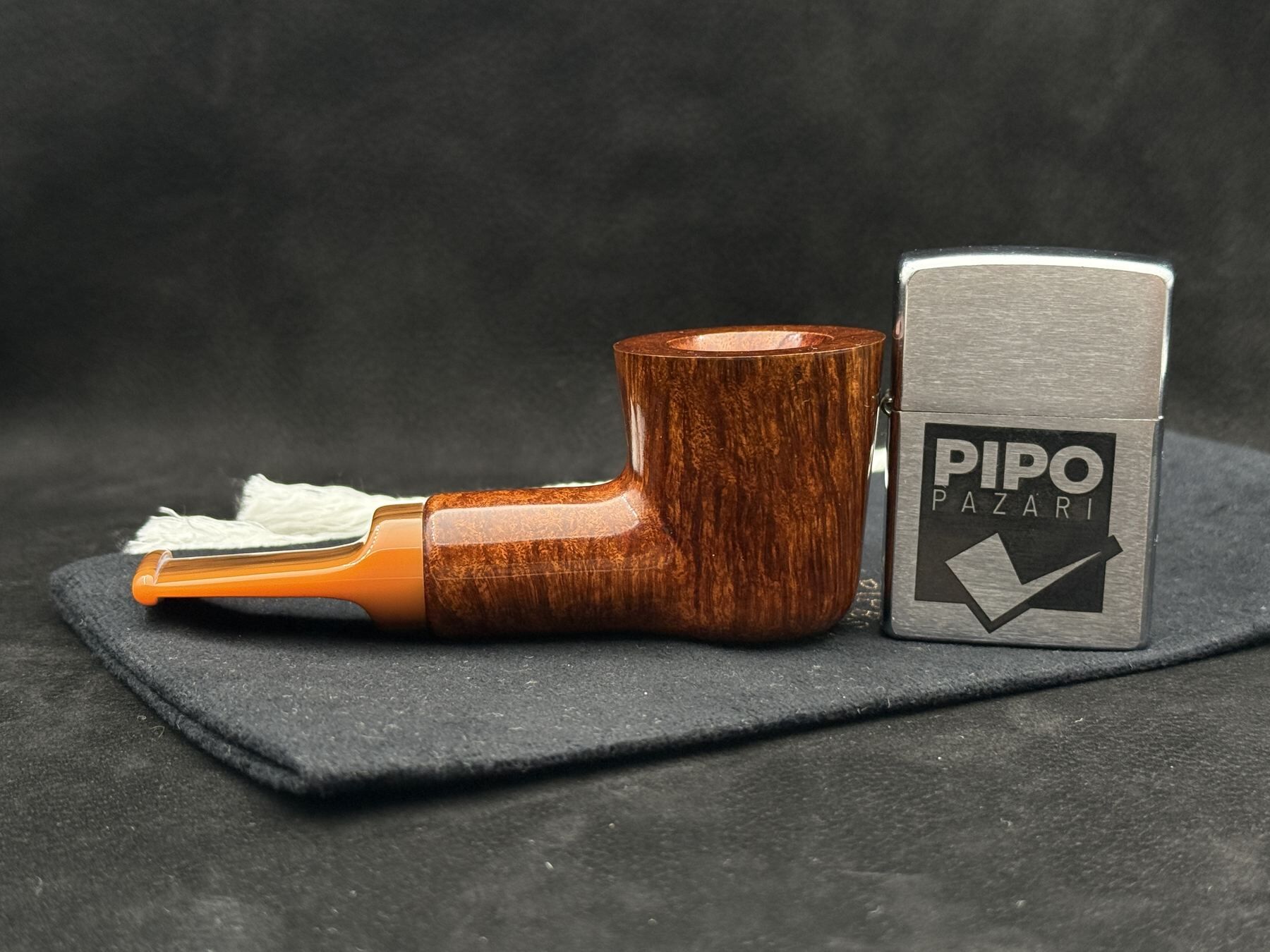 Bu pipoda yüzeyin karakteri, Reverse Calabash’in ilham aldığı küresel formu kompakt bir aksanla taşır. Cila, ışığı keskin bir yansıma gibi değil, formu belirginleştiren bir mühür gibi taşır. Bowl’dan stem’e uzanan hat, grafiksel bir kırılma barındırmaz; dumanın soğuma ve dolaşımını ima eden akılcı bir siluet sunar. Stem’in akrilik yapısı, piponun temas aksanını bölmeyen, tasarımın çağdaş ortağı gibi eşlik eden bir unsurdur. 423, JohnnyPipes’in formda gizlenen mühür anlayışının en sakin ama en karakterli yorumlarından biridir.