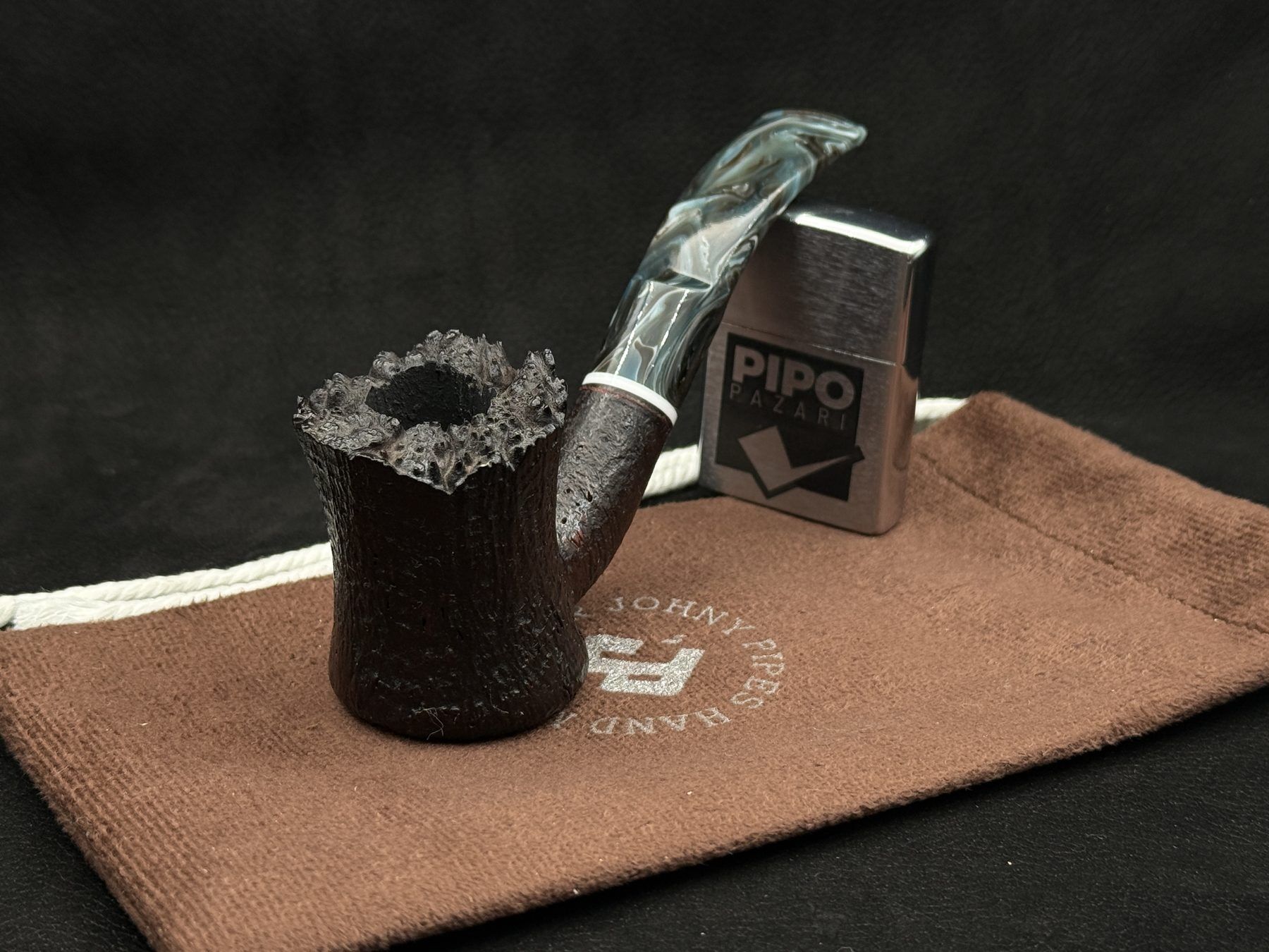 Johnypipes 234 modeli, Cherrywood formunu plateaux (doğal kök kenarı) detayıyla birlikte sunarak oldukça karakterli bir siluet ortaya koyuyor. Bowl’un üst kısmında bırakılan doğal ve ham kenar yapısı, her açıdan farklı bir dokusal zenginlik gösterirken derin kumlama yüzey briarın damarlarını belirgin biçimde vurguluyor. Dikey yükselen gövde formu sayesinde masa üzerinde dengeli durabilen bu tasarım, görsel olarak heykelsi bir etki yaratıyor. Damarlı akrilik ağızlık ise rustik gövdeye modern ve enerjik bir kontrast katıyor.