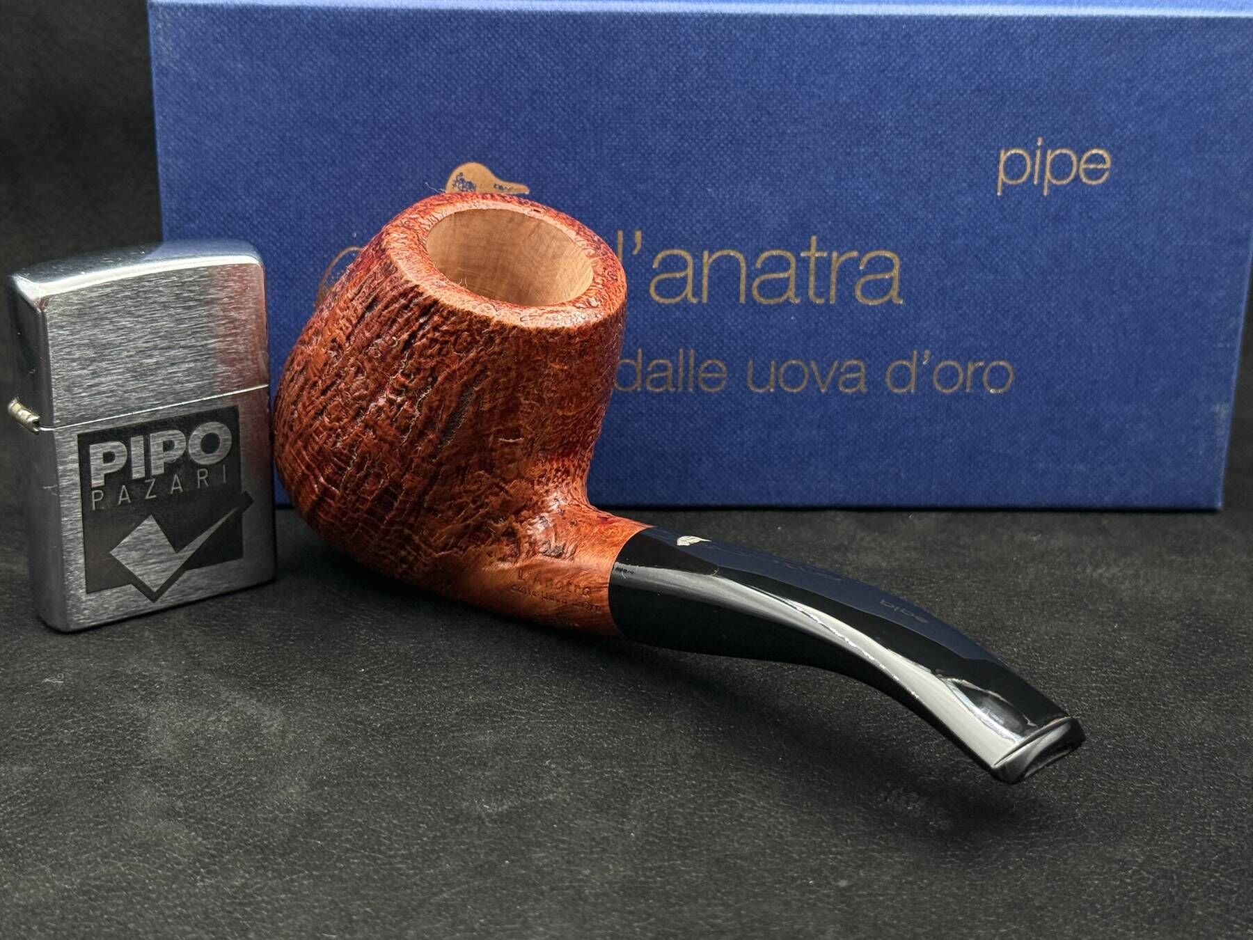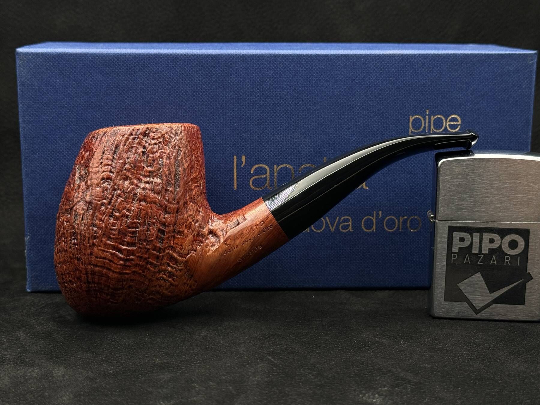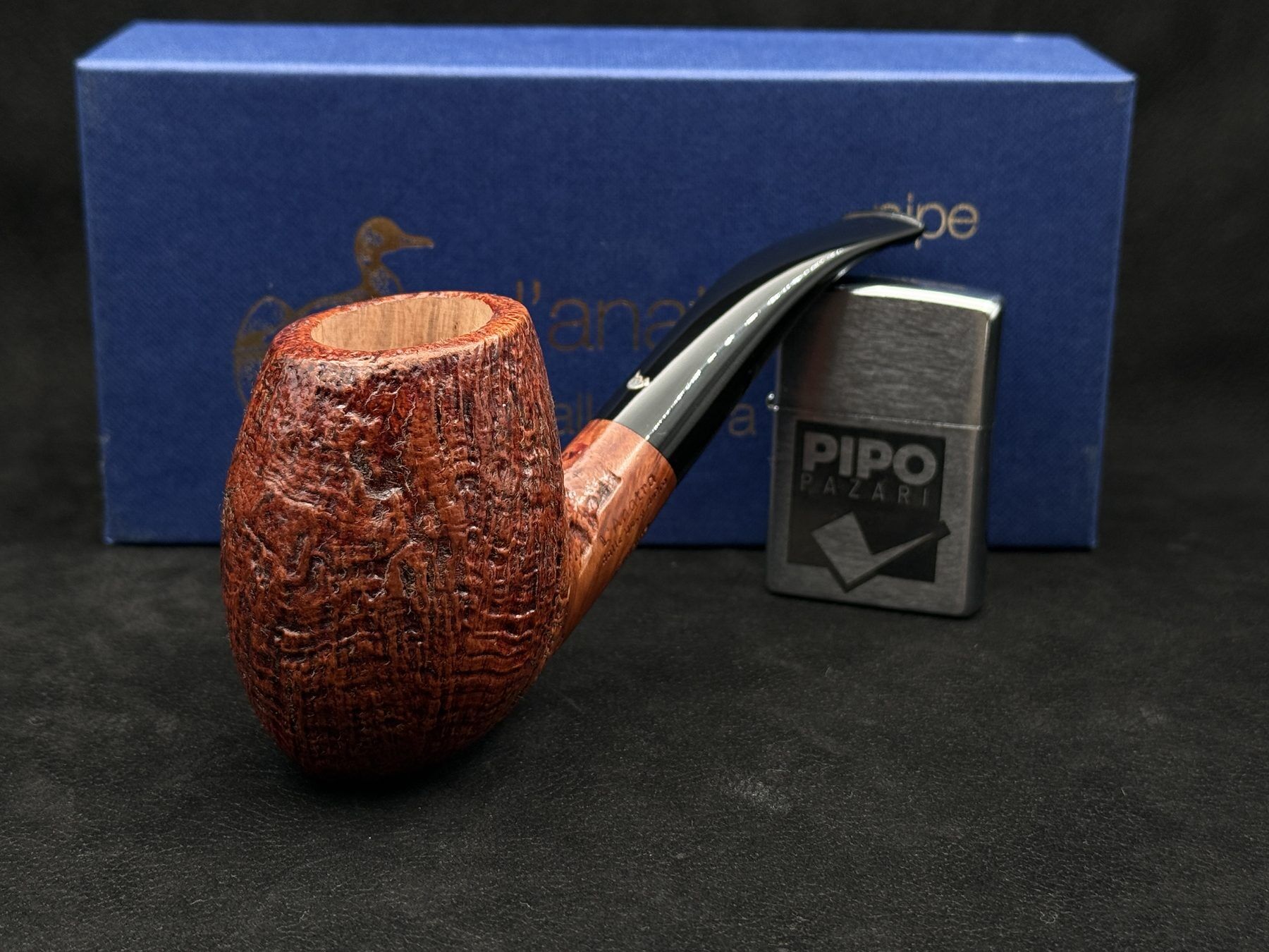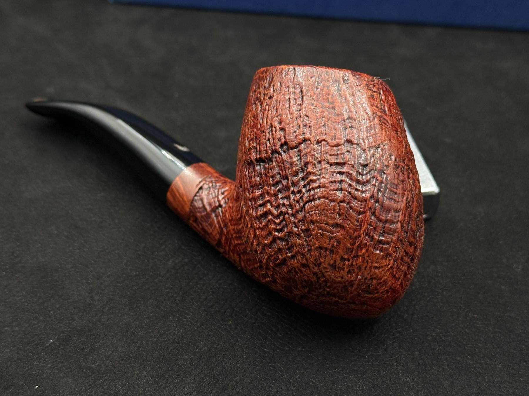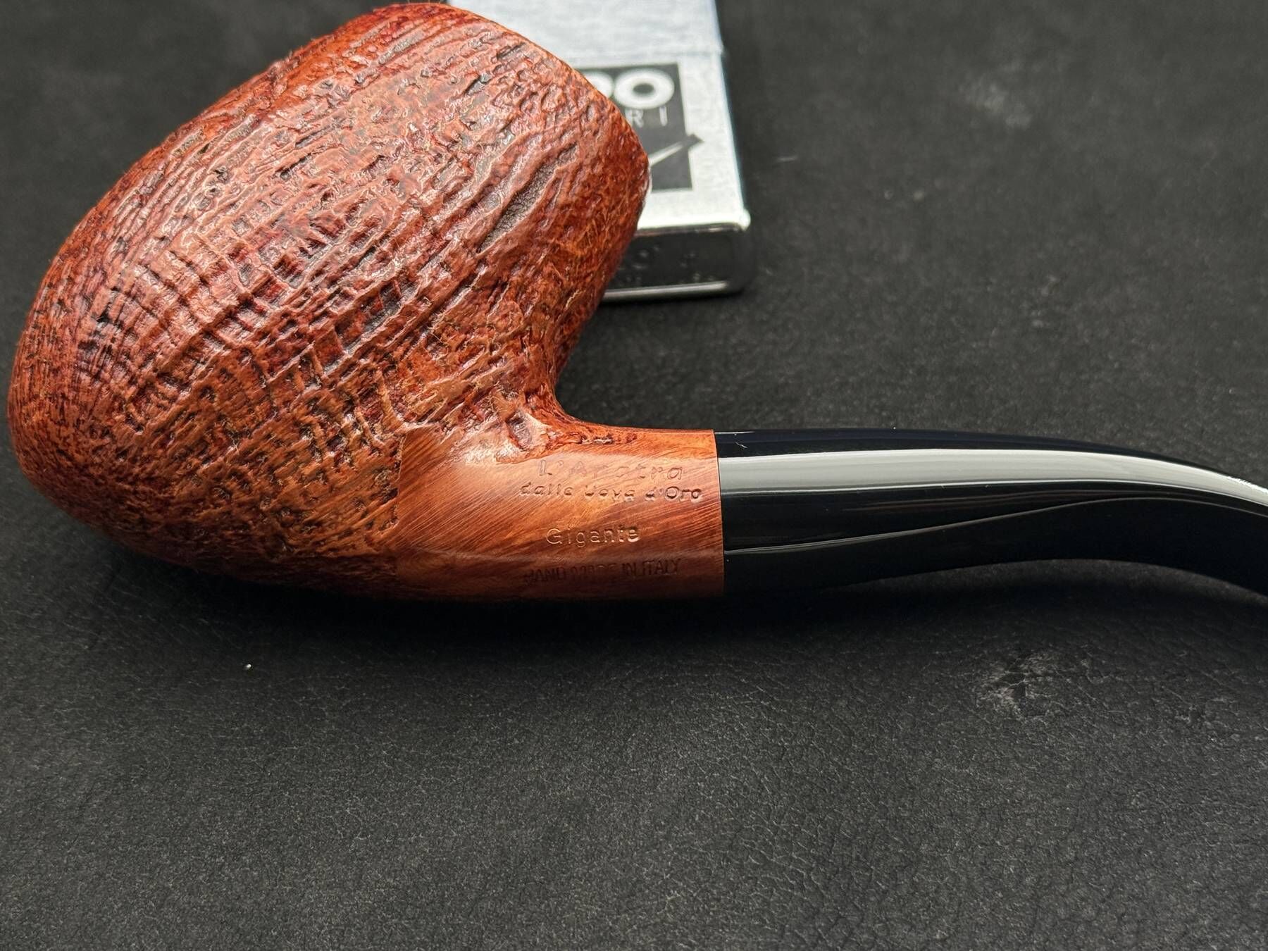 Lanatra’nın “Gigante” olarak adlandırdığı bu model, ismini yalnızca ölçülerinden değil, taşıdığı hacim ve görsel ağırlıktan alıyor. 88 gramlık ağırlığıyla standart ölçülerin belirgin şekilde üzerinde konumlanan bu Half Bent form, dolgun haznesi ve geniş gövde yapısıyla uzun ve sakin içimler için tasarlanmış bir karakter sunuyor. Kumlama (sandblast) uygulaması, briarın yıllık halka yapısını derin biçimde ortaya çıkararak yüzeye güçlü bir topoğrafya kazandırmış. Özellikle geniş bowl formu üzerinde kumlamanın dalgalı geçişleri belirgin şekilde okunuyor; bu da modeli hem görsel hem dokunsal açıdan zenginleştiriyor.