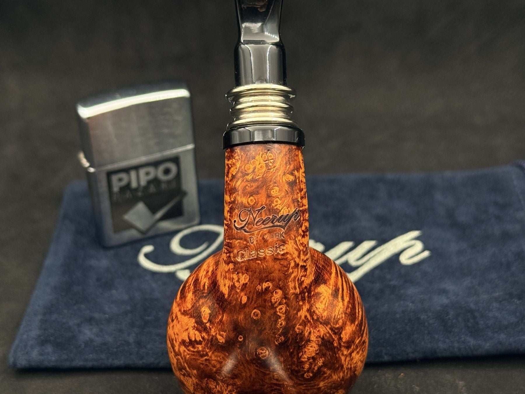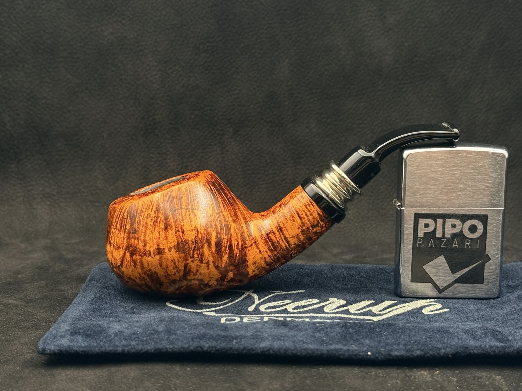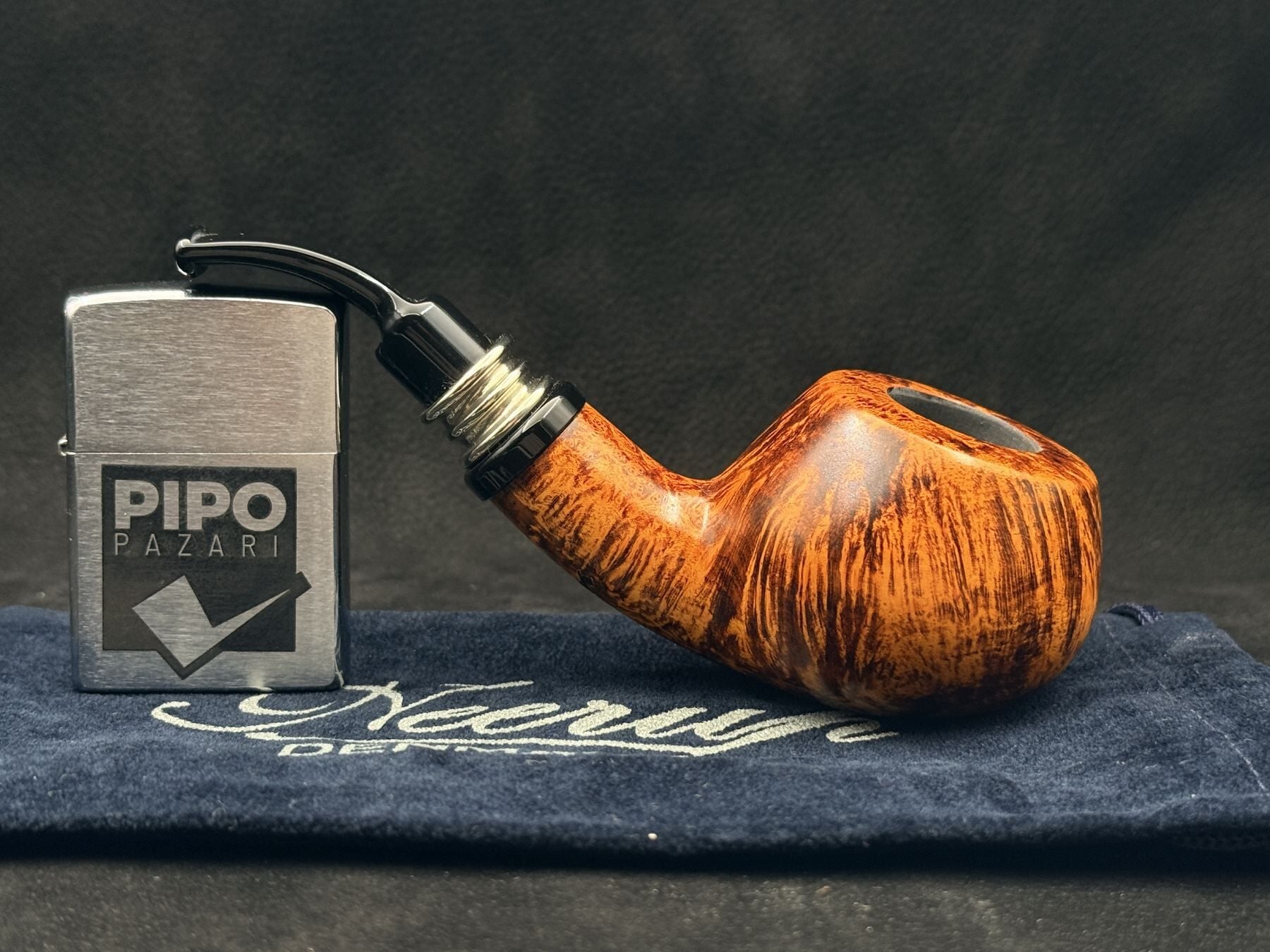 Neerup Classic GR4 Bent Pipo, Neerup Classic GR4 serisinin briar yüzeydeki belirgin damar akışıyla öne çıkan karakterli modellerinden biridir. Gövde üzerinde yukarı doğru tırmanan alev damarlar (flame grain), yer yer yoğunlaşan kuş gözü dokularla birleşerek dinamik ve canlı bir yüzey oluşturuyor. Mat pürüzsüz bitiş sayesinde bu doğal yapı parlaklıkla örtülmeden, daha organik ve dengeli bir şekilde ortaya çıkıyor. Bent form, hazneden ağızlığa doğru akıcı bir geçiş sunarken hem estetik hem de kullanım açısından rahat bir deneyim sağlıyor. Özellikle elde tutulduğunda dengeli yapısı ve kompakt hissiyle günlük kullanıma son derece uygun bir profil çiziyor. Neerup Classic GR4 Bent Pipo, dengeli formu ve güçlü damar yapısıyla estetik ve karakterli bir duruş sunar. Neerup Classic GR4 Bent Pipo, doğal yüzeyi sayesinde briar’ın tüm detaylarını sade ama etkileyici şekilde ortaya koyar.
