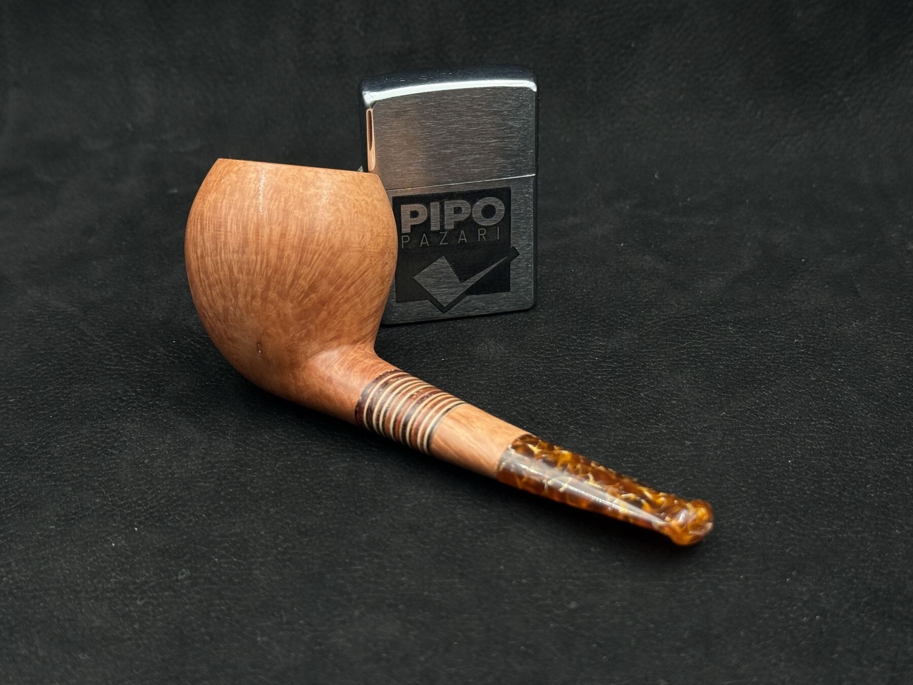 Rizza markası altında üretim yapan usta Reza A. Sane, doğal briar dokusunu ön planda tutan sade ve dengeli tasarımlarıyla tanınır. Bu modelde de ustanın müdahaleyi minimumda tutan yaklaşımı açık biçimde görülür; form, ağacın doğal akışına saygılı şekilde şekillendirilmiştir. Parçalı ahşap yüzük detayı, pipoya hem görsel derinlik hem de el işçiliği vurgusu kazandırır.