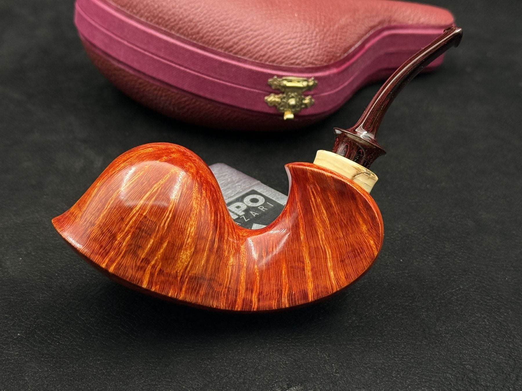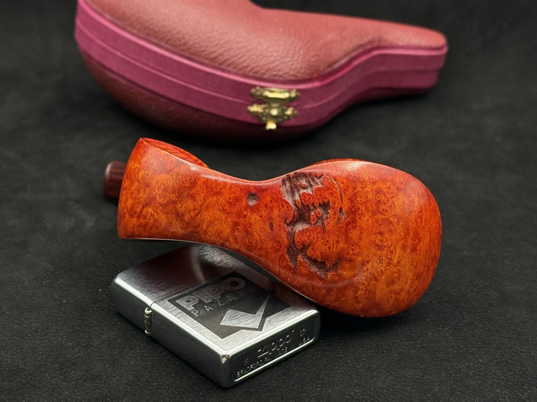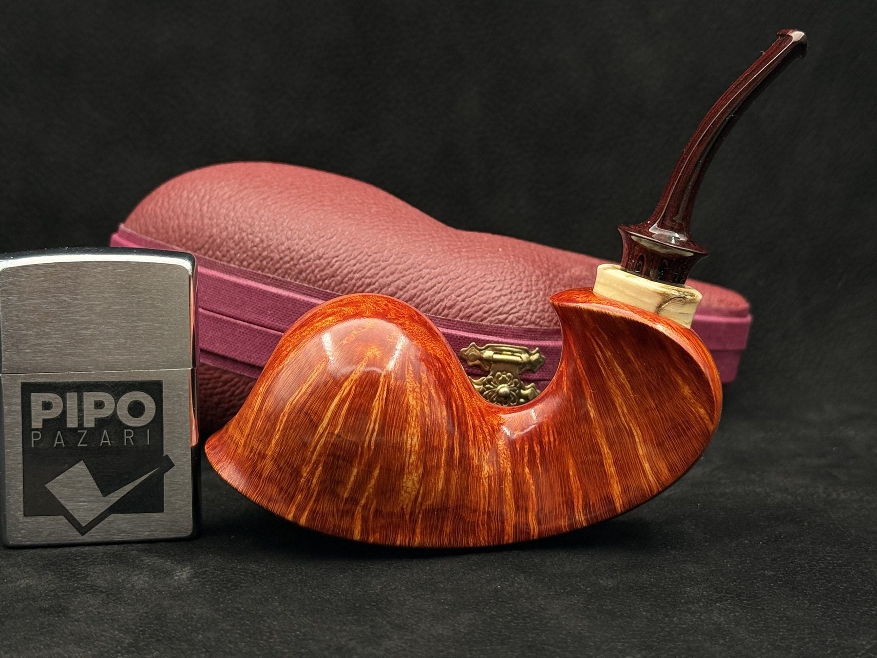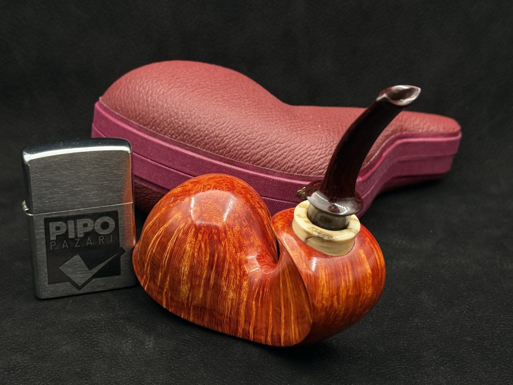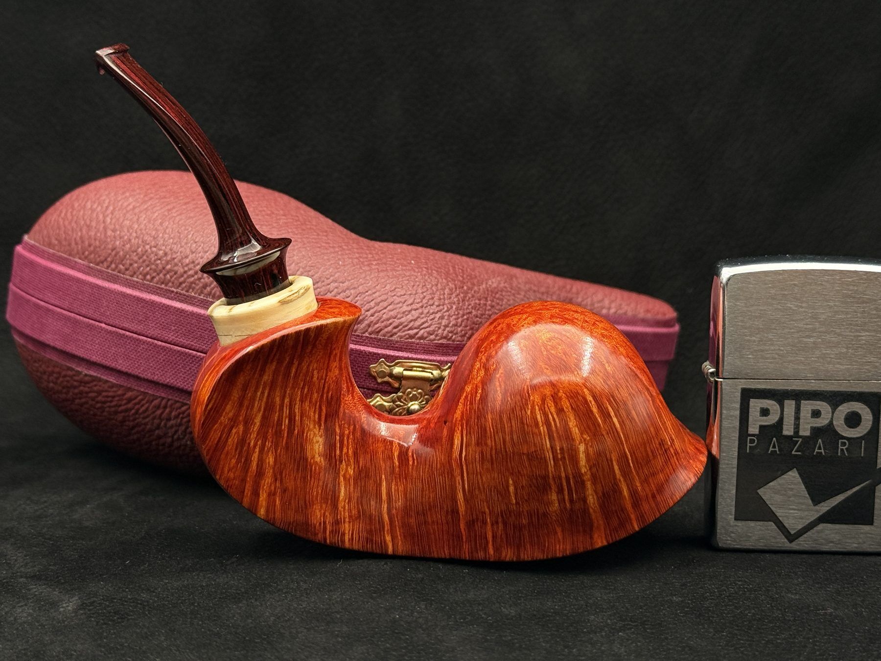 Sabahattin Urgan’ın el işçiliğiyle şekillendirdiği bu özgün briar pipo, akışkan hatları ve heykelsi yapısıyla klasik formların dışına çıkan bir freehand tasarım sunar. Gövdenin iki yana doğru genişleyip ortada derin bir geçiş oluşturması, pipoya güçlü bir siluet kazandırırken üst kısımdaki hazne formu doğal bir yükseliş hissi yaratır. Briarın yüzeyinde görülen belirgin damar akışı ve alt bölümdeki kuş gözü dokuları, kullanılan ağacın kaliteli yapısını açıkça ortaya koyar.