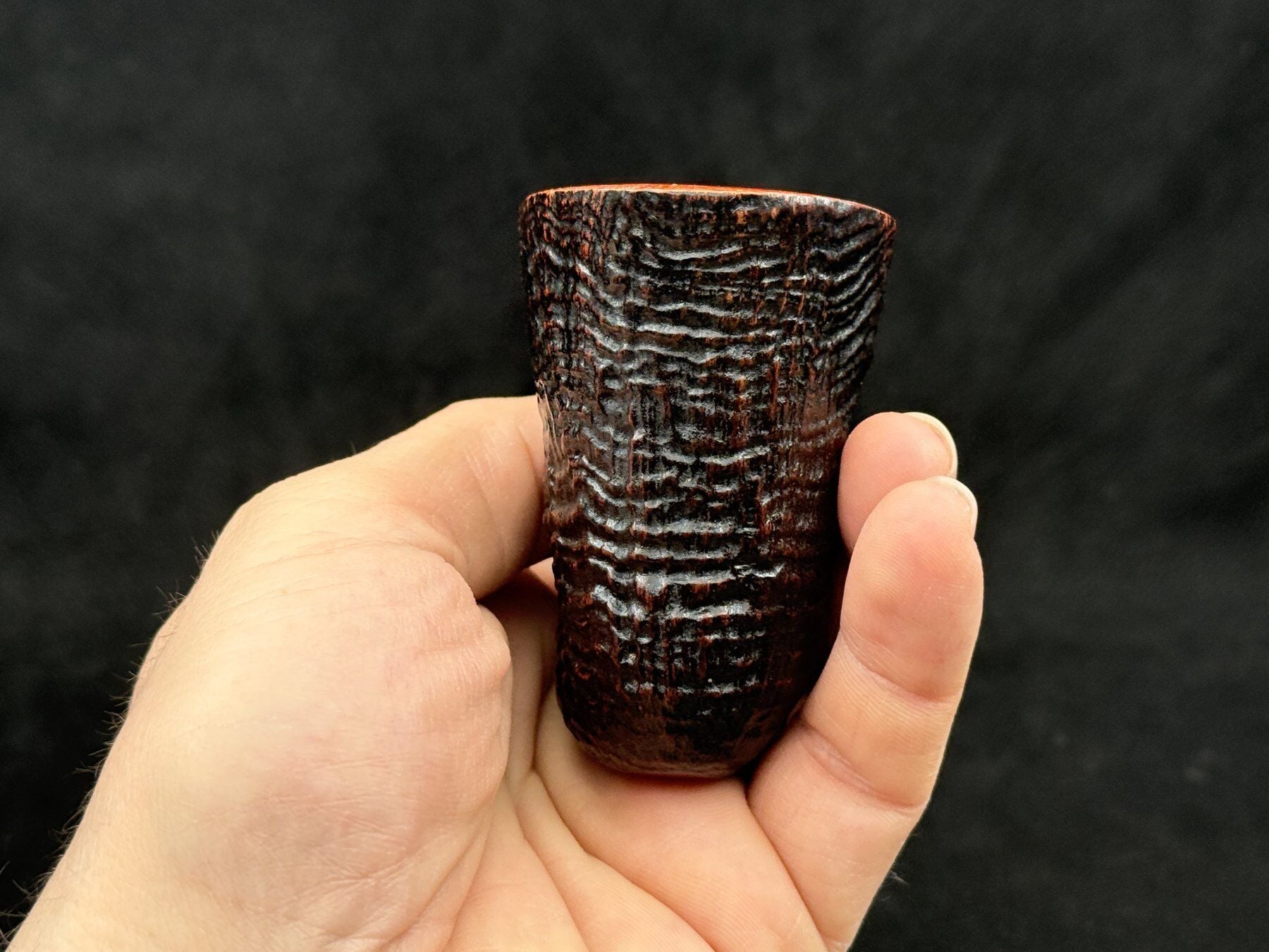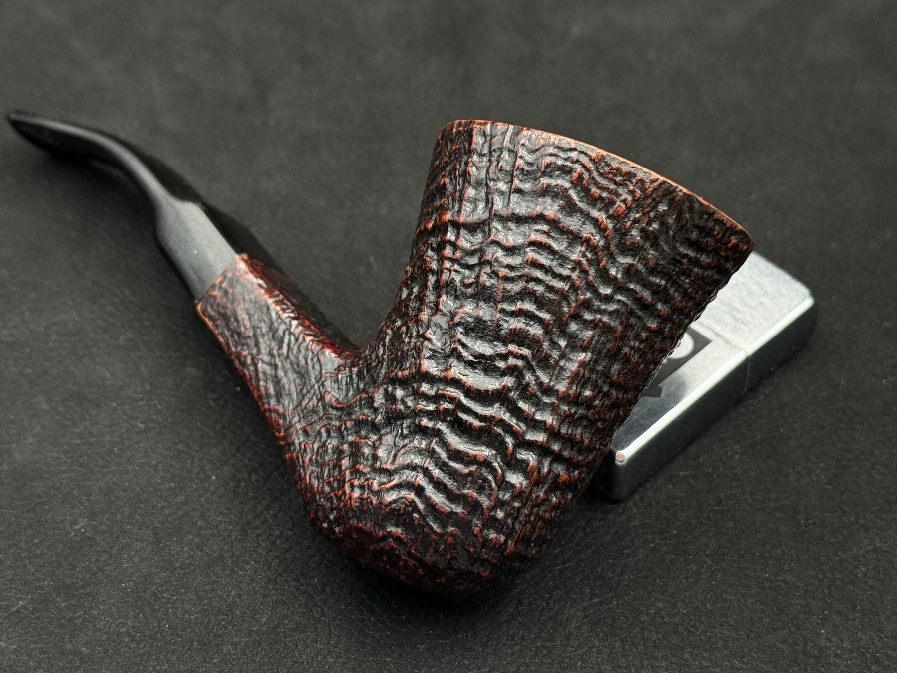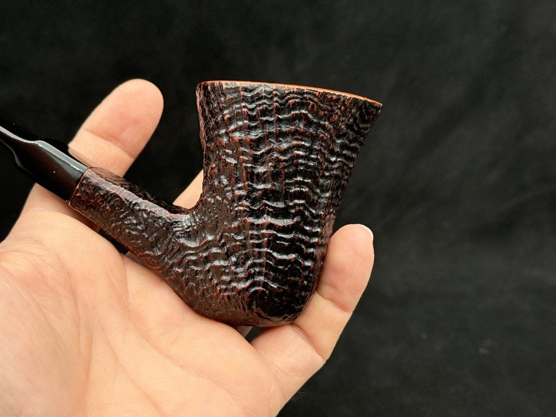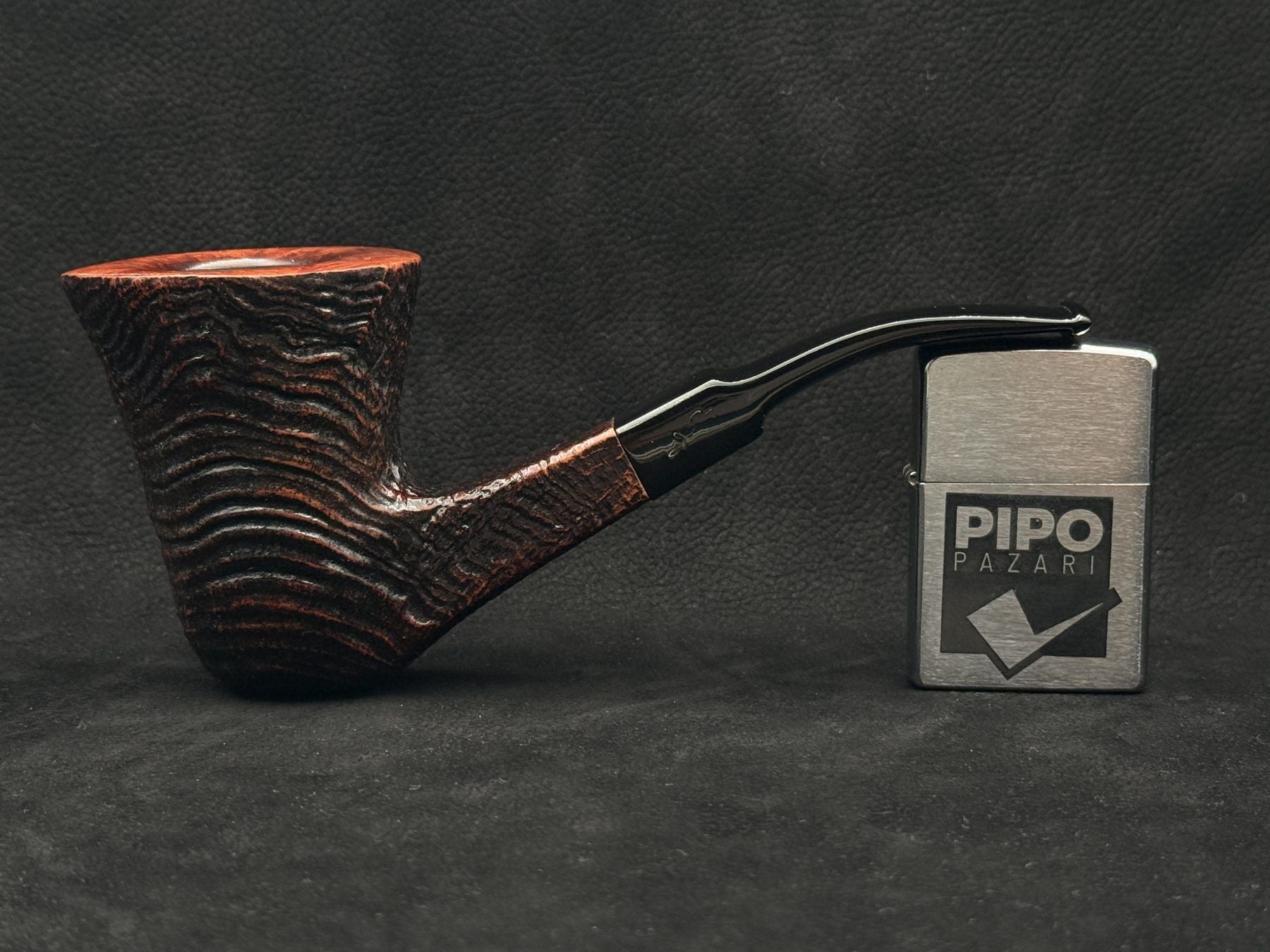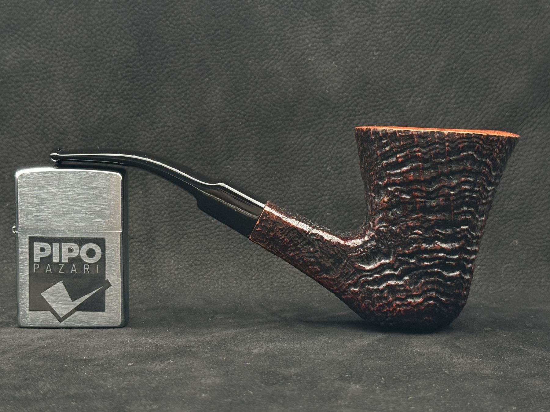 Derin ve kontrastlı kumlama (sandblast) yüzey, briarın damar yapısını üç boyutlu bir şekilde ortaya çıkararak oldukça etkileyici bir doku sunar. Hazne üst kısmındaki doğal geçişler ve formun genişleyerek yükselen yapısı, pipoya güçlü ve maskülen bir karakter kazandırır. Bu tarz kumlama işçiligi, yalnızca yüksek kaliteli briar bloklarında elde edilebilen özel bir yüzey derinliği sunar.