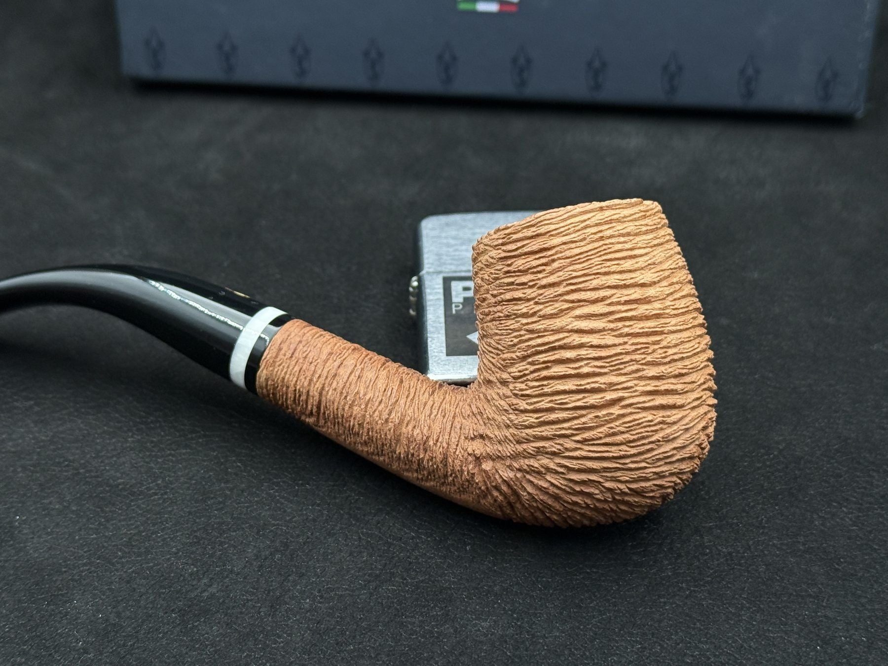 Bu modelde kullanılan doğal rustik doku, yüzeyde derin ve katmanlı bir görünüm oluşturarak pipoya güçlü bir karakter kazandırır. Açık tonlu doğal renk geçişleri, briarın doğallığını ön plana çıkarırken, siyah akrilik ağızlık ile birlikte dengeli bir kontrast sunar. Gövde ile ağızlık arasında yer alan ince geçiş detayı ise tasarımı sade ama şık bir çizgide tamamlar.