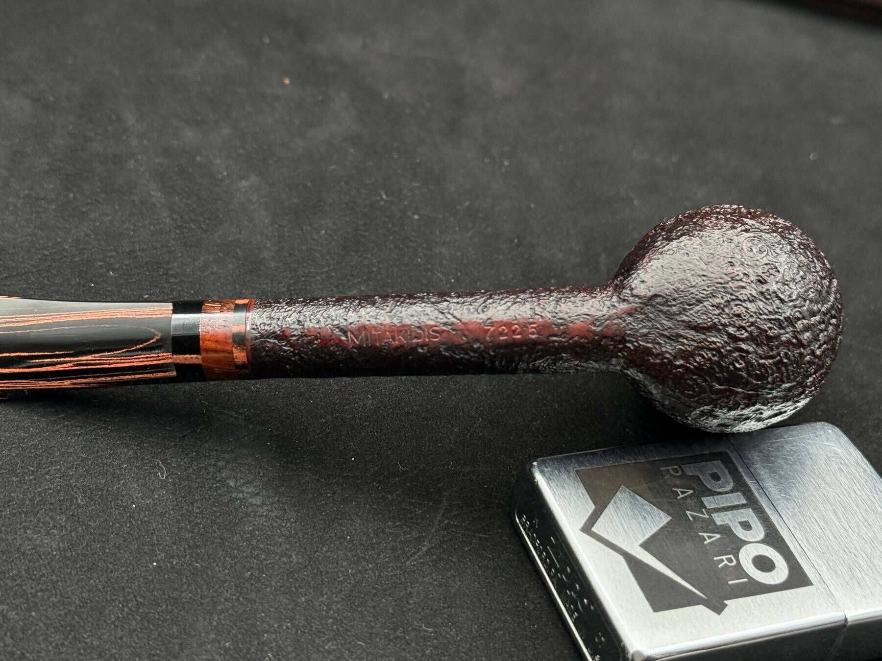 7225 Lovat modeli, klasik Lovat siluetinin Mitakidis yorumu olarak öne çıkar. Kumlama bitiriş, gövde üzerinde doğal briar dokusunu belirgin biçimde ortaya çıkarırken, yüzeyde kontrollü bir derinlik hissi yaratır. Ağızlıkta kullanılan ahşap yüzük detayı, pipoya sıcak ve doğal bir geçiş kazandırır; ebonit ağızlıkla uyumlu bir bütünlük sunar. İnce boyun yapısı ve dengeli gövde oranları, Lovat formunun karakteristik sakin duruşunu korurken elde ve ağızda konforlu bir deneyim vadeder. Bu pipo, Yorgos Mitakidis’in ölçülü tasarım anlayışını ve kumlama bitirişteki ustalığını net biçimde yansıtan, koleksiyonluk bir örnektir.